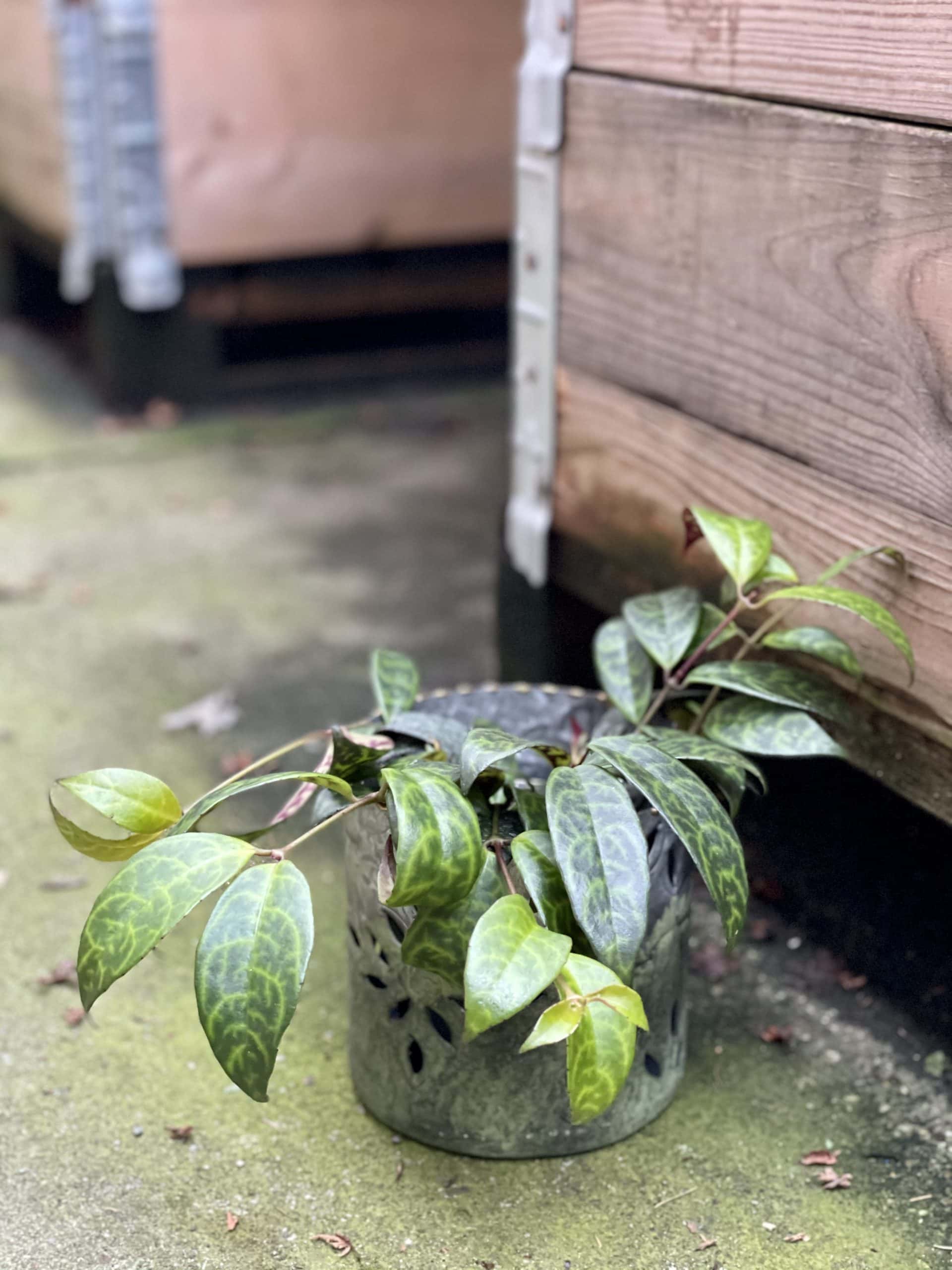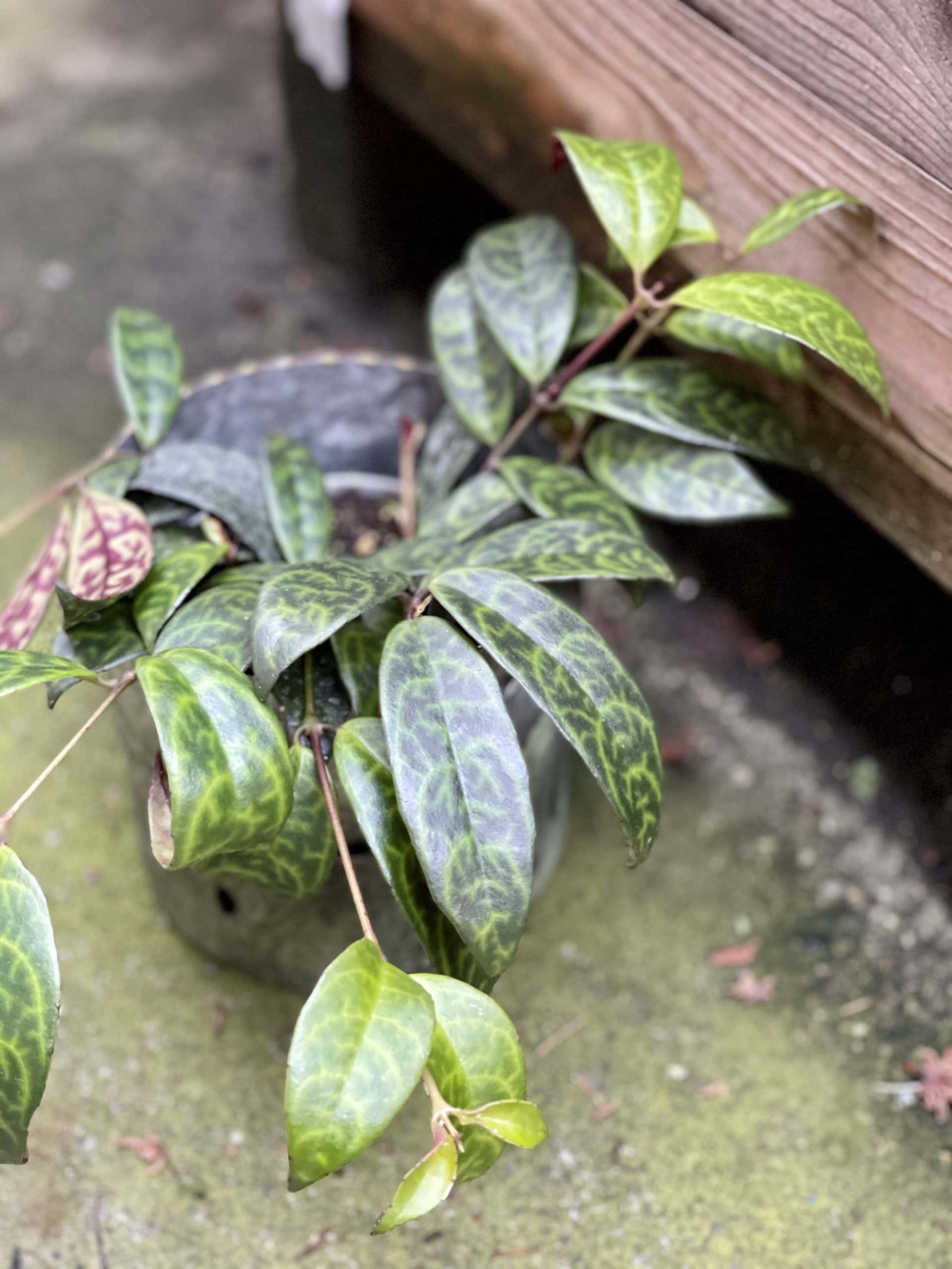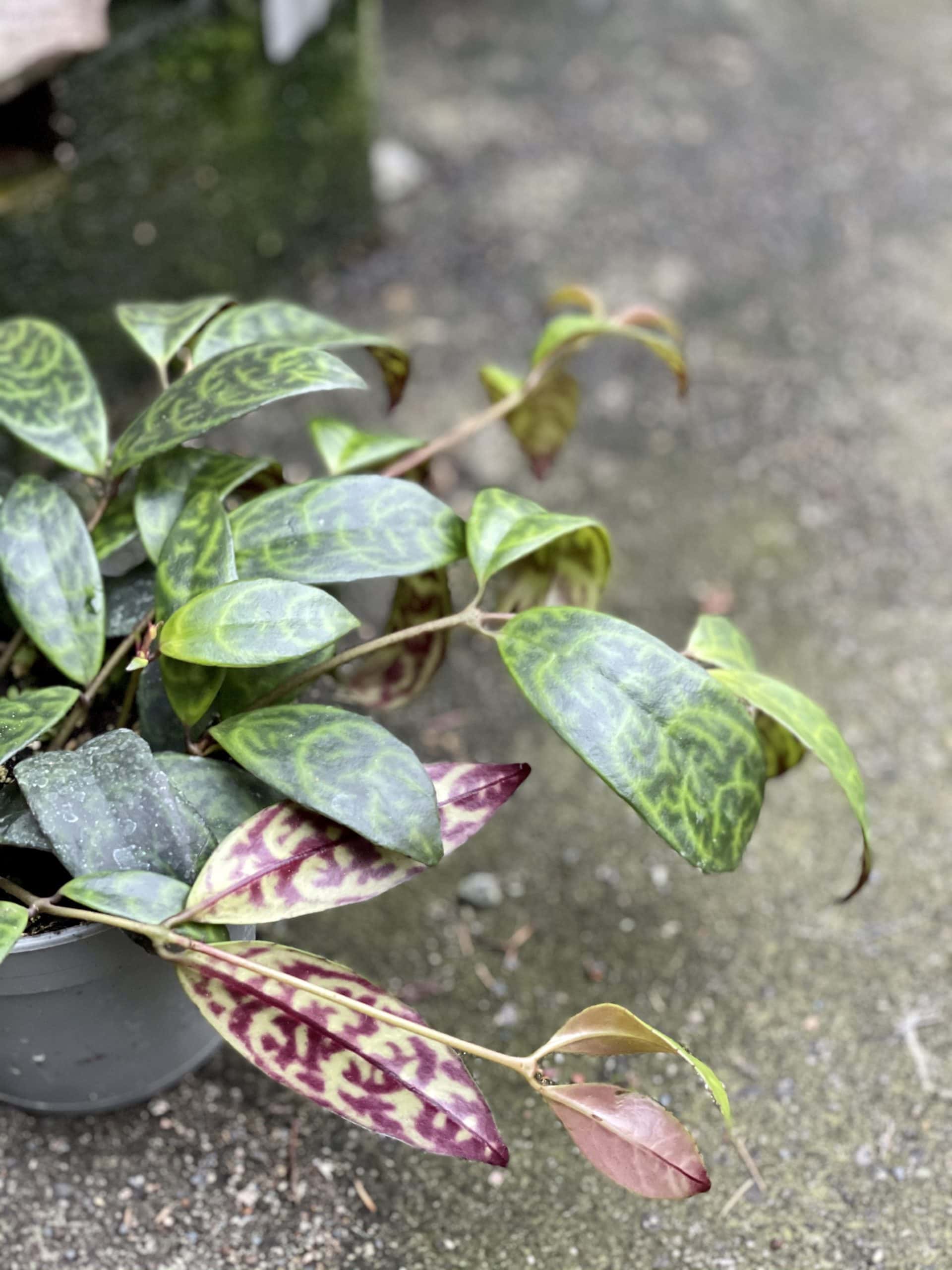 Aeschynanthus Marmoratus to bardzo intrygująca odmiana eszynantusa. Gęsty i zwisający pokrój typowy dla tego gatunku uzupełniają oryginalne liście ozdobione mozaikowym wzorem, który od spodu jest intensywnie bordowy.