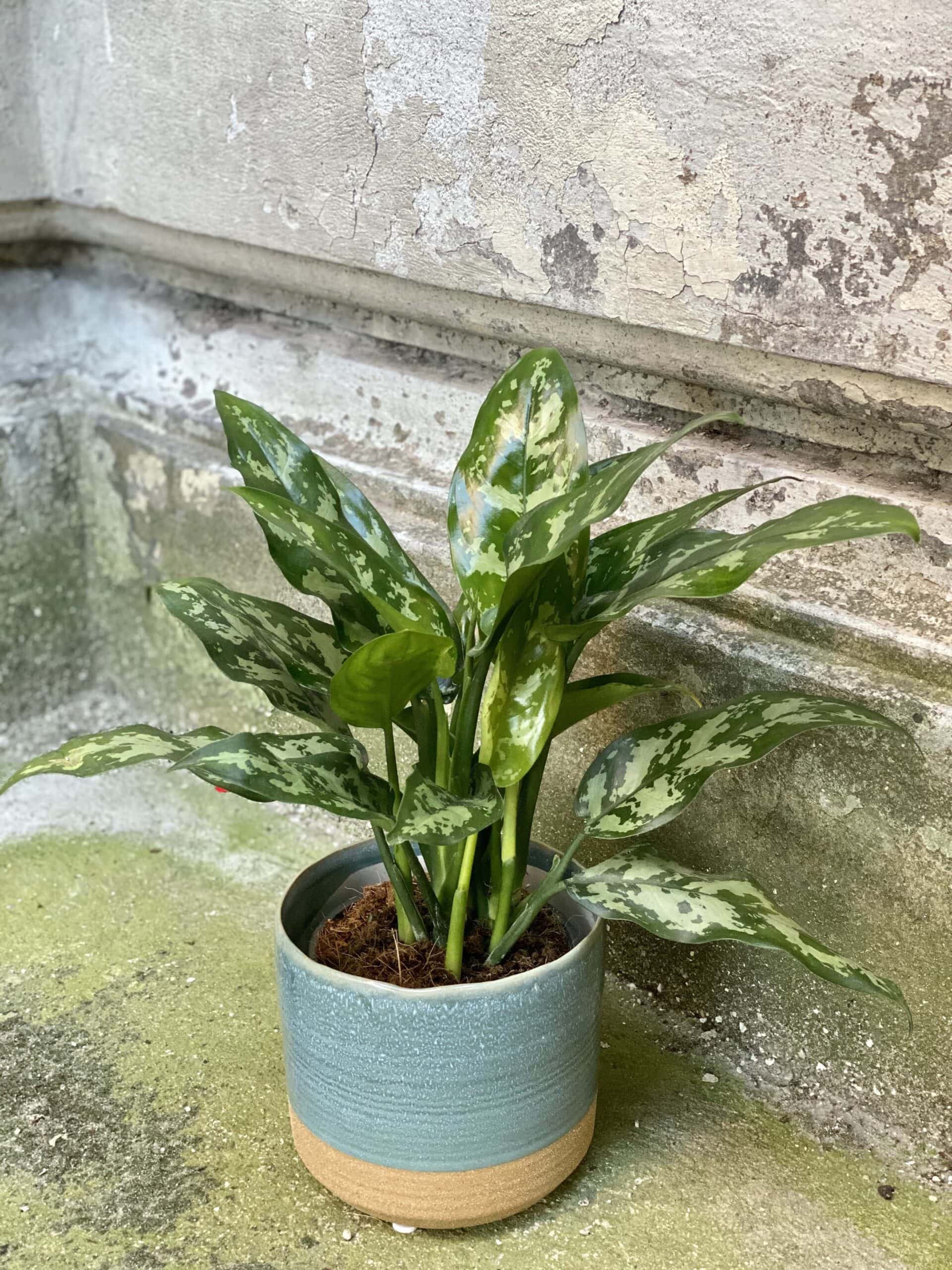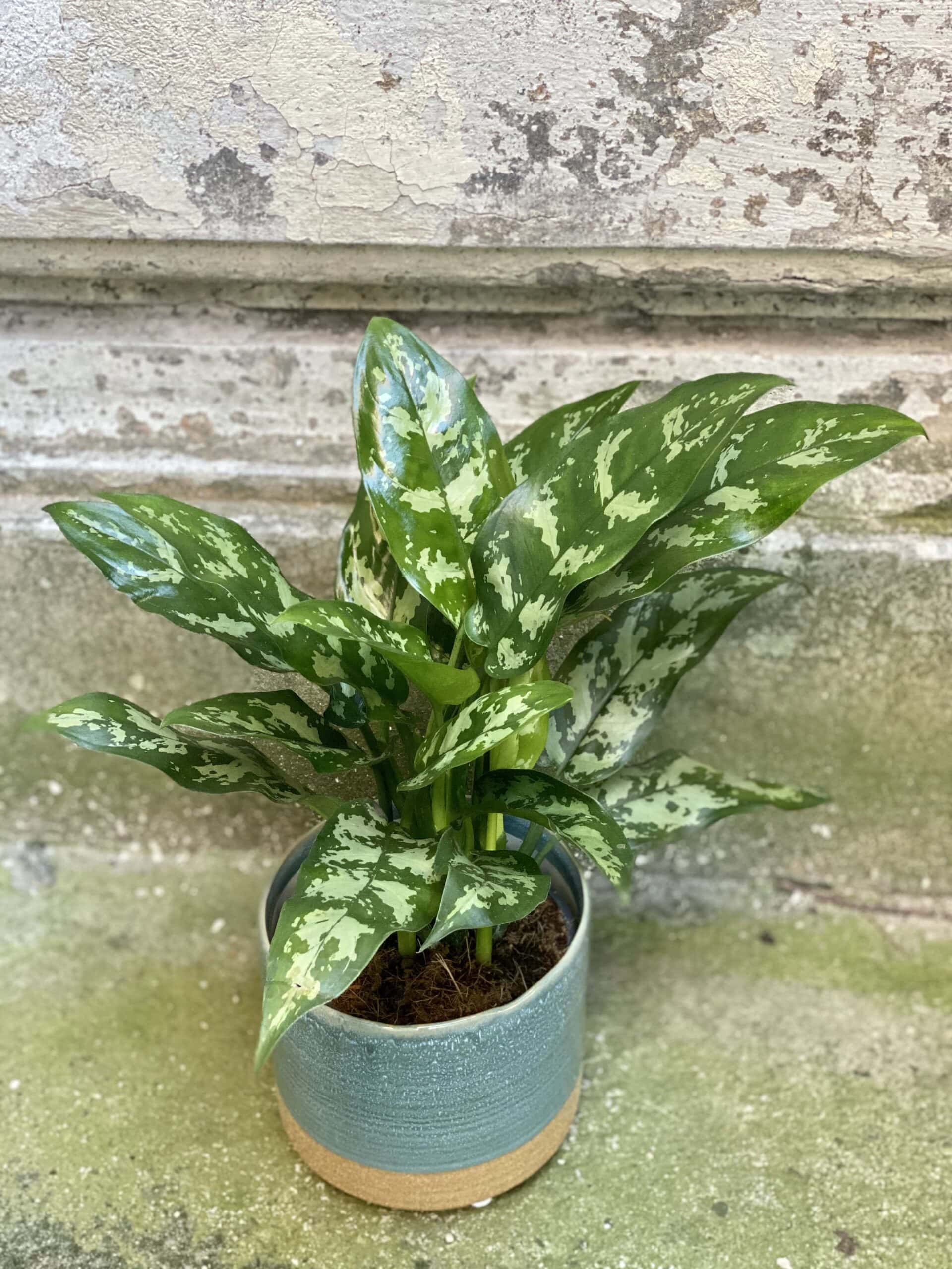 Widoczna na zdjęciu roślina: Aglaonema Gemini ma wysokość około 30 cm. Jej doniczka ma 14 cm średnicy oraz 12 cm wysokości.