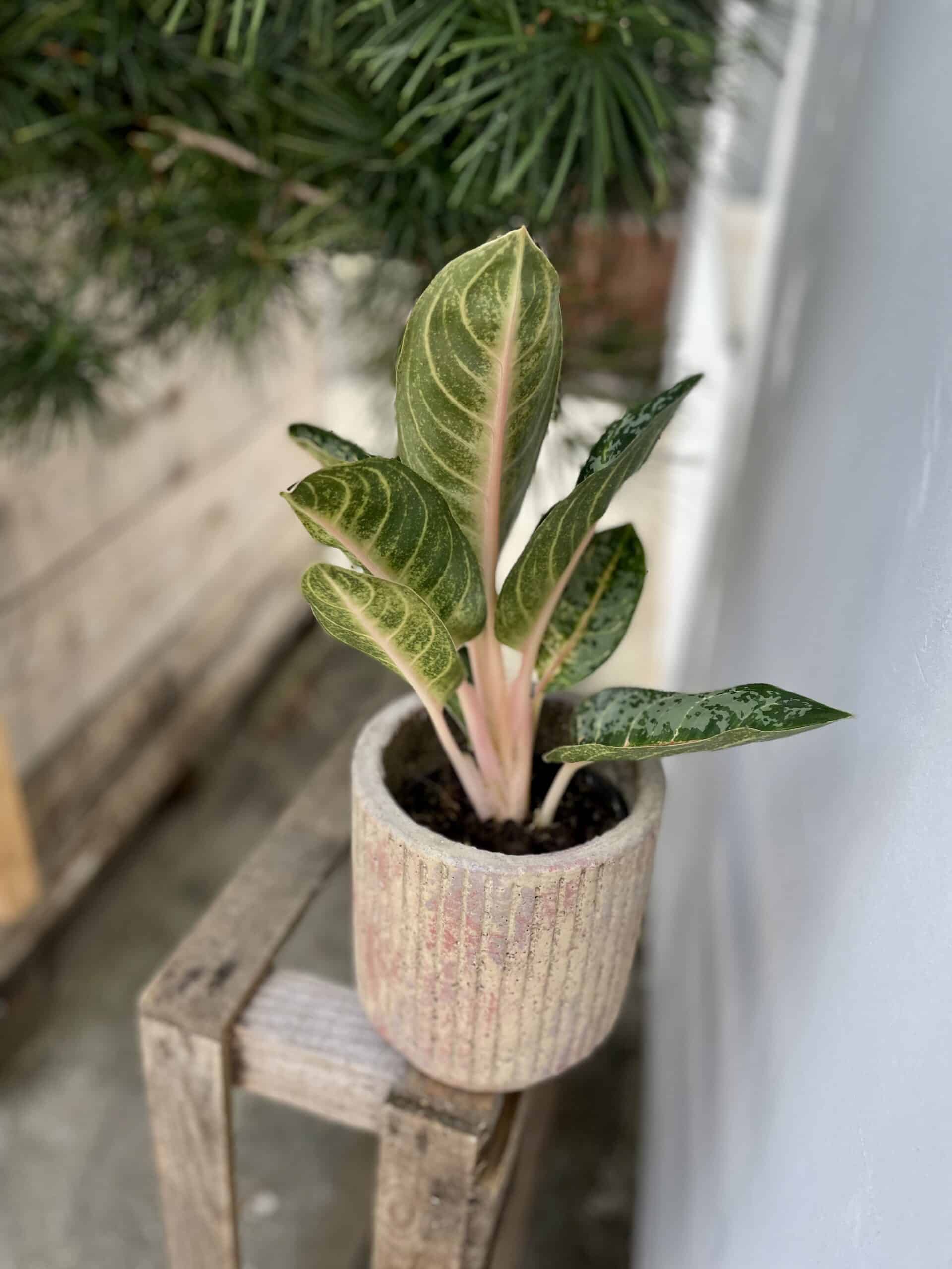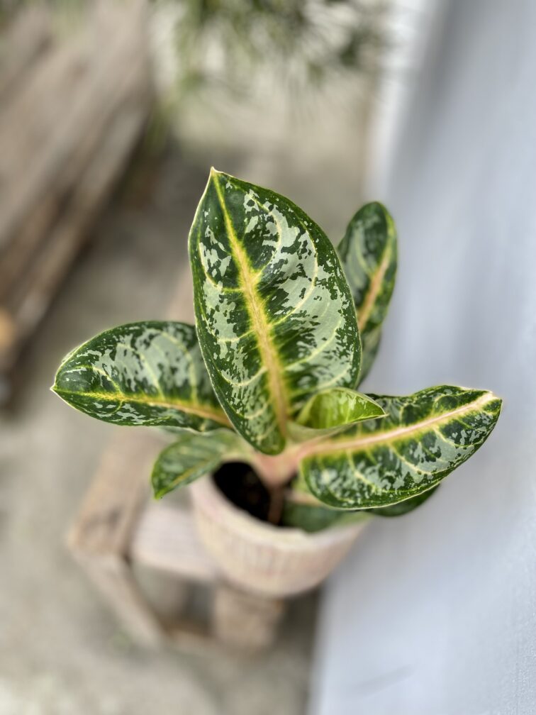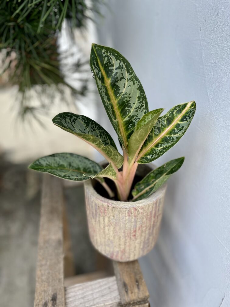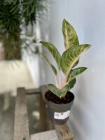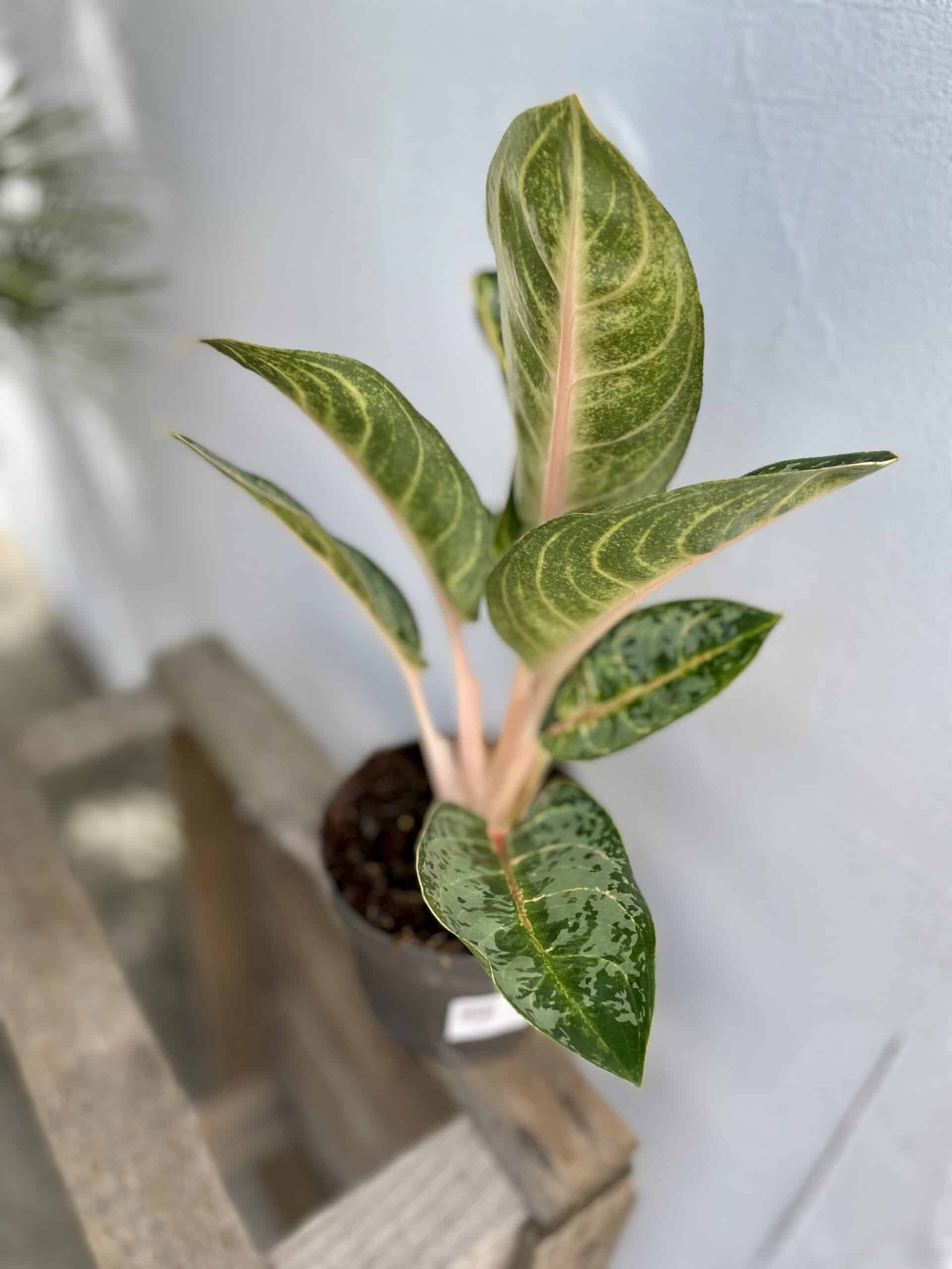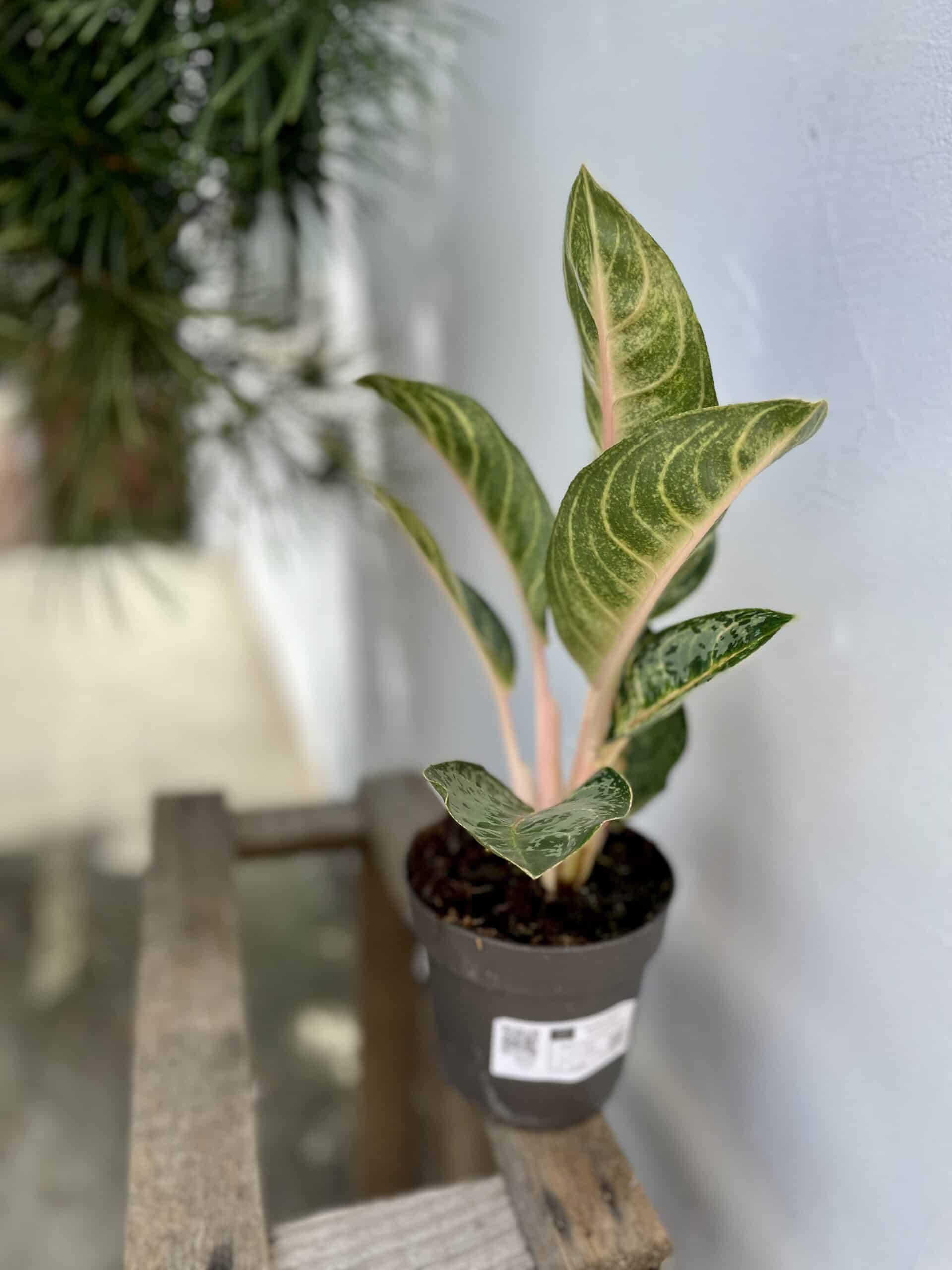Bardzo dekoracyjna Aglaonema, o pięknie rozmieszczonej kompozycji barw i wzorów. Chłodna mięta i ciemna zieleń wzbogacona jest łososiowym różem na nerwie głównym i słoneczną żółcią na bocznych żyłkach rośliny.