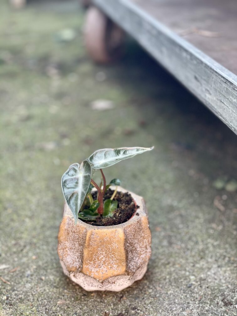 Widoczna na zdjęciu roślina: Alocasia Amazonica ma wysokość około 12 cm. Jej doniczka ma 5 cm średnicy oraz 5 cm wysokości.