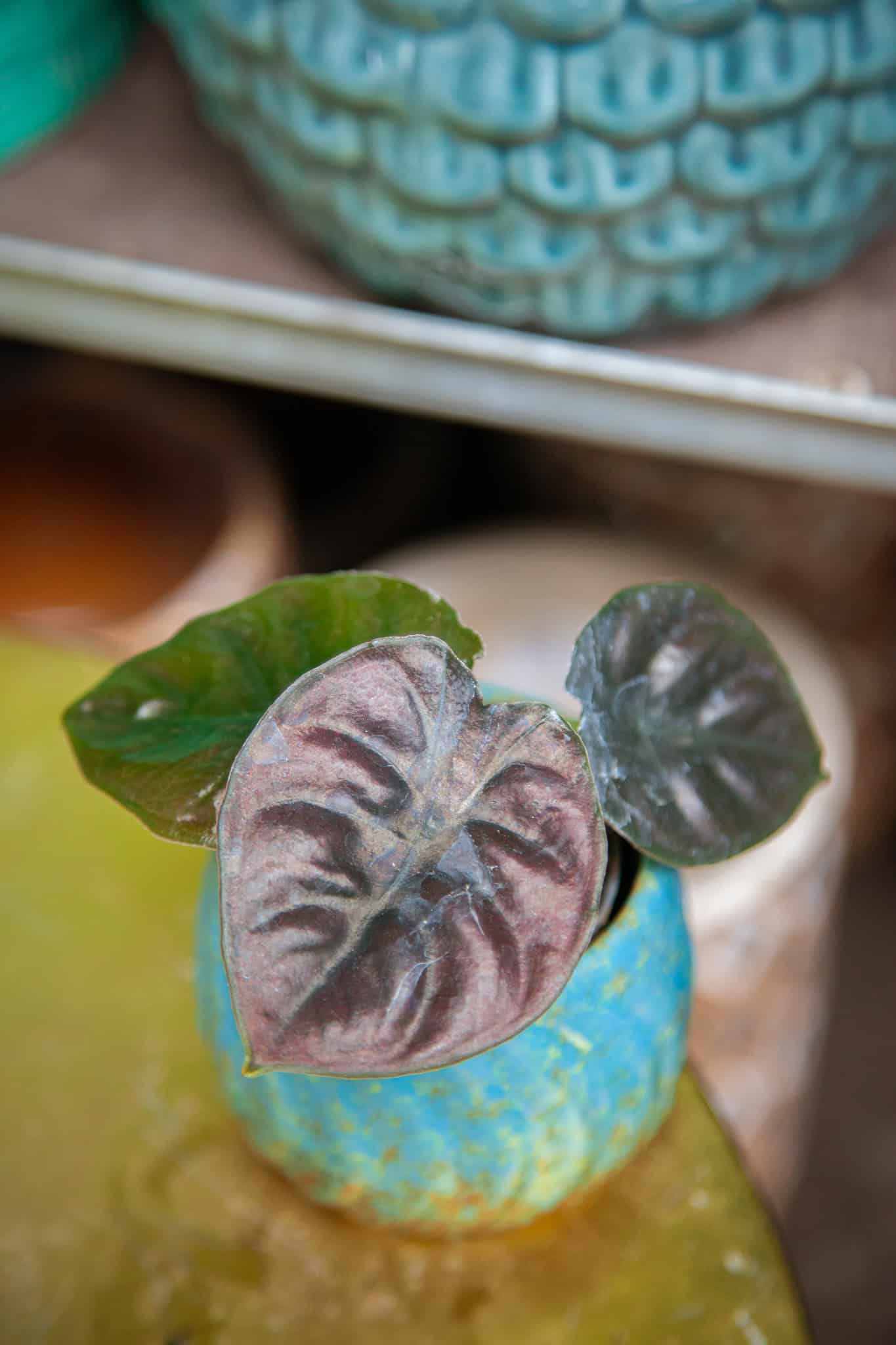 Ta niezwykła alokazja przyciąga wzrok lśniącymi liśćmi w kolorze niemal czarnym, i o niejednorodnej, ciekawej fakturze. Wspaniale mieni się w słońcu, choć stanowisko dla niej powinno być osłonięte od jego bezpośrednich promieni.