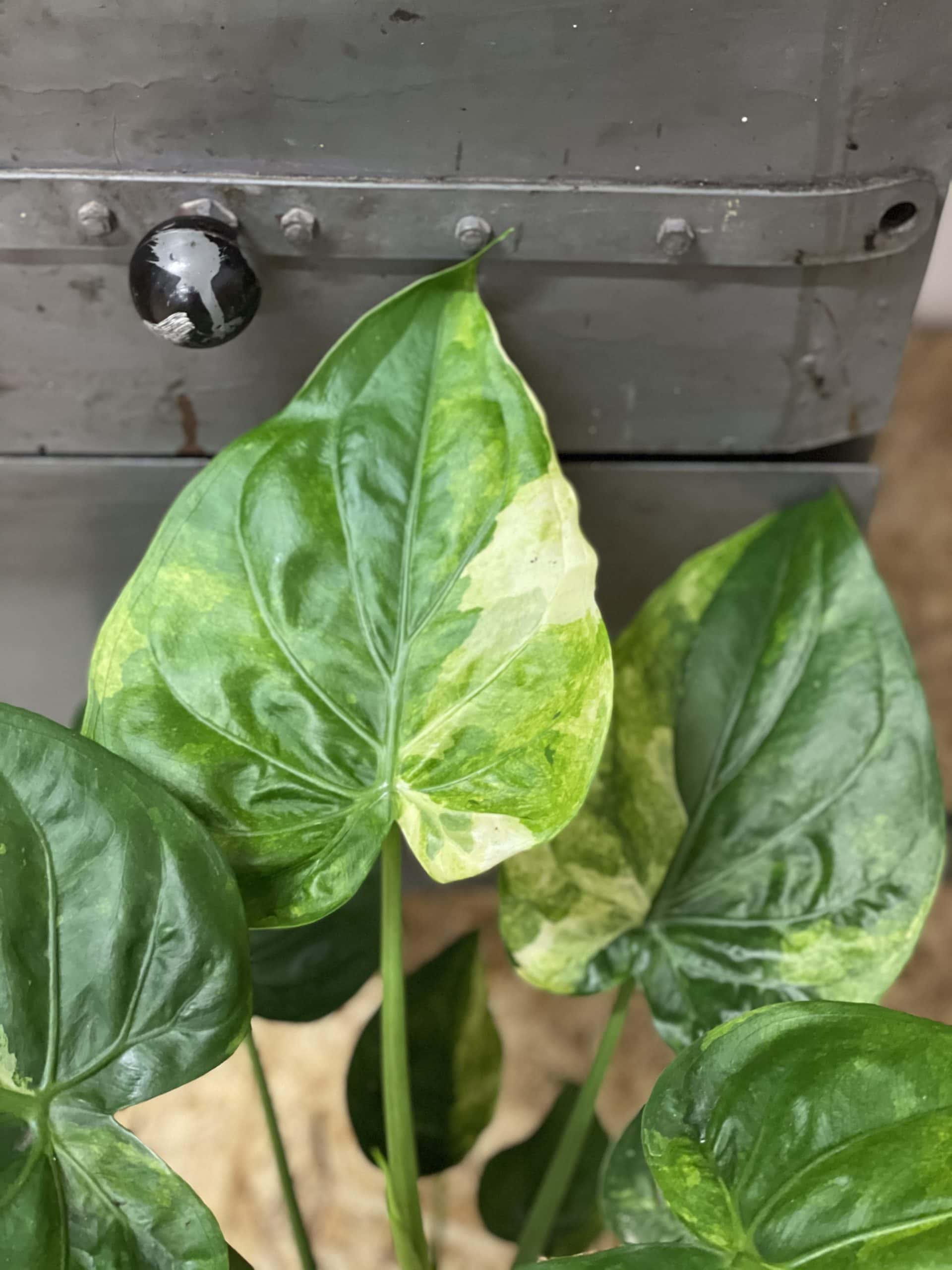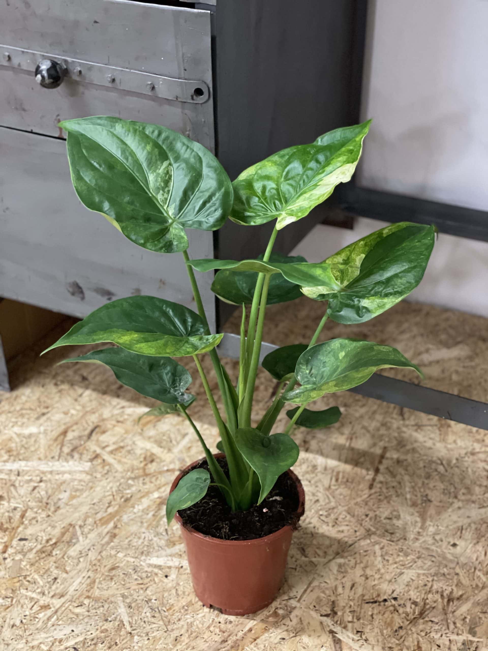 Widoczna na zdjęciu roślina: Alocasia cucullata variegata nr 1 ma wysokość około 70 cm. Jej doniczka ma 19 cm średnicy oraz 17 cm wysokości.