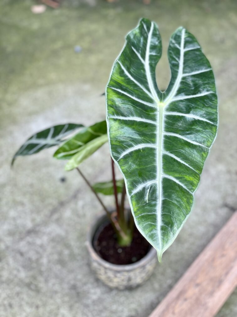 Alocasia Longiloba o alokazja o wydłużonych liściach. Longus to łacińskie słowo oznaczające “długi”, a lobus oznacza “zaokrąglony”, co nawiązuje do kształtu liści tej wyjątkowej alokazji. Pamiętajmy o wysokiej wilgotności powietrza i wystrzegajmy się przelania i przesuszenia podłoża, a szybko wypuści kolejne liście!