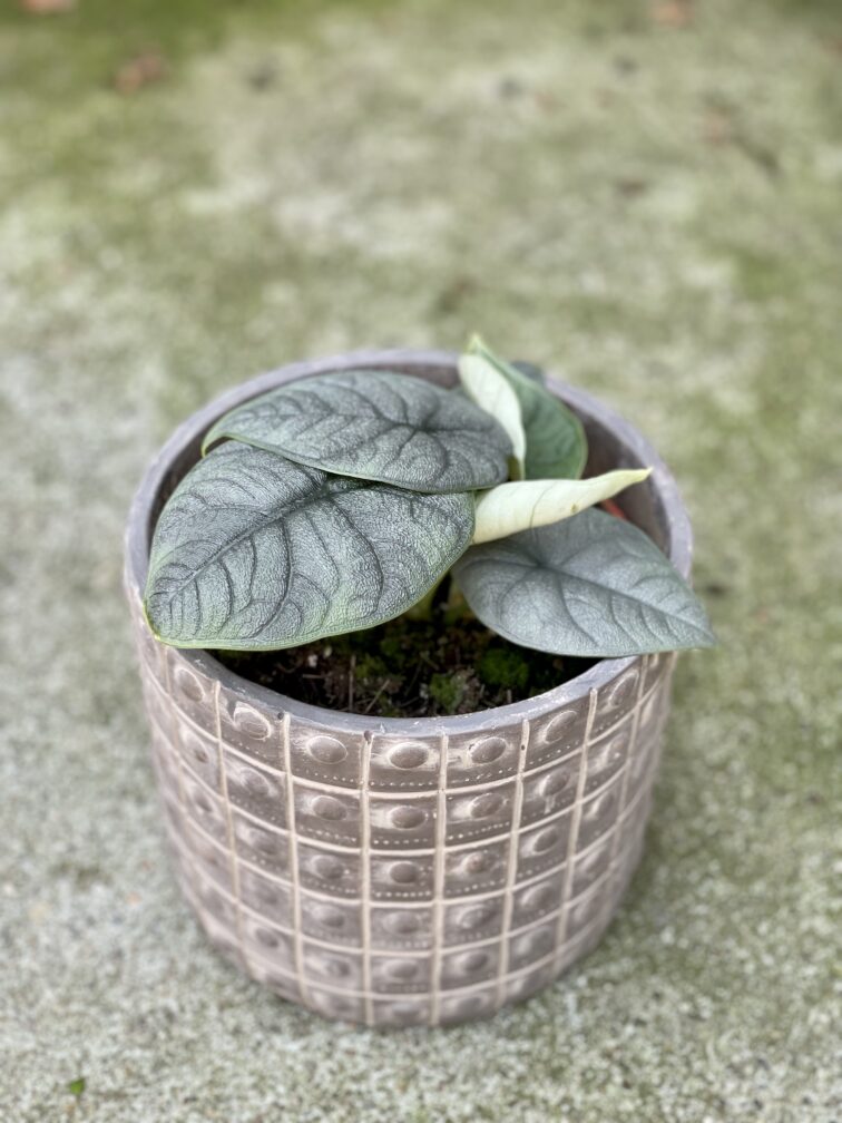 Widoczna na zdjęciu roślina: Alocasia Melo ma wysokość około 20 cm. Jej doniczka ma 13 cm średnicy oraz 12 cm wysokości.