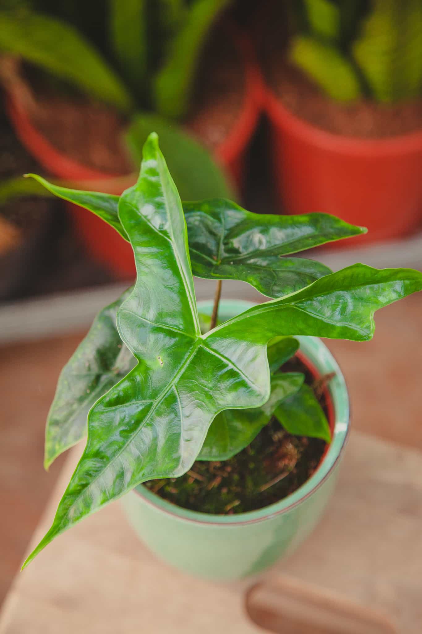 Alokazja, której strzałkowate liście przypominają nieco skrzydła nietoperza w locie.