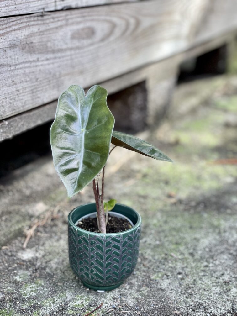 Widoczna na zdjęciu roślina: Alocasia Pseudo Sanderiana ma wysokość około 20 cm. Jej doniczka ma 6 cm średnicy oraz 5 cm wysokości.