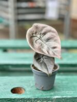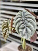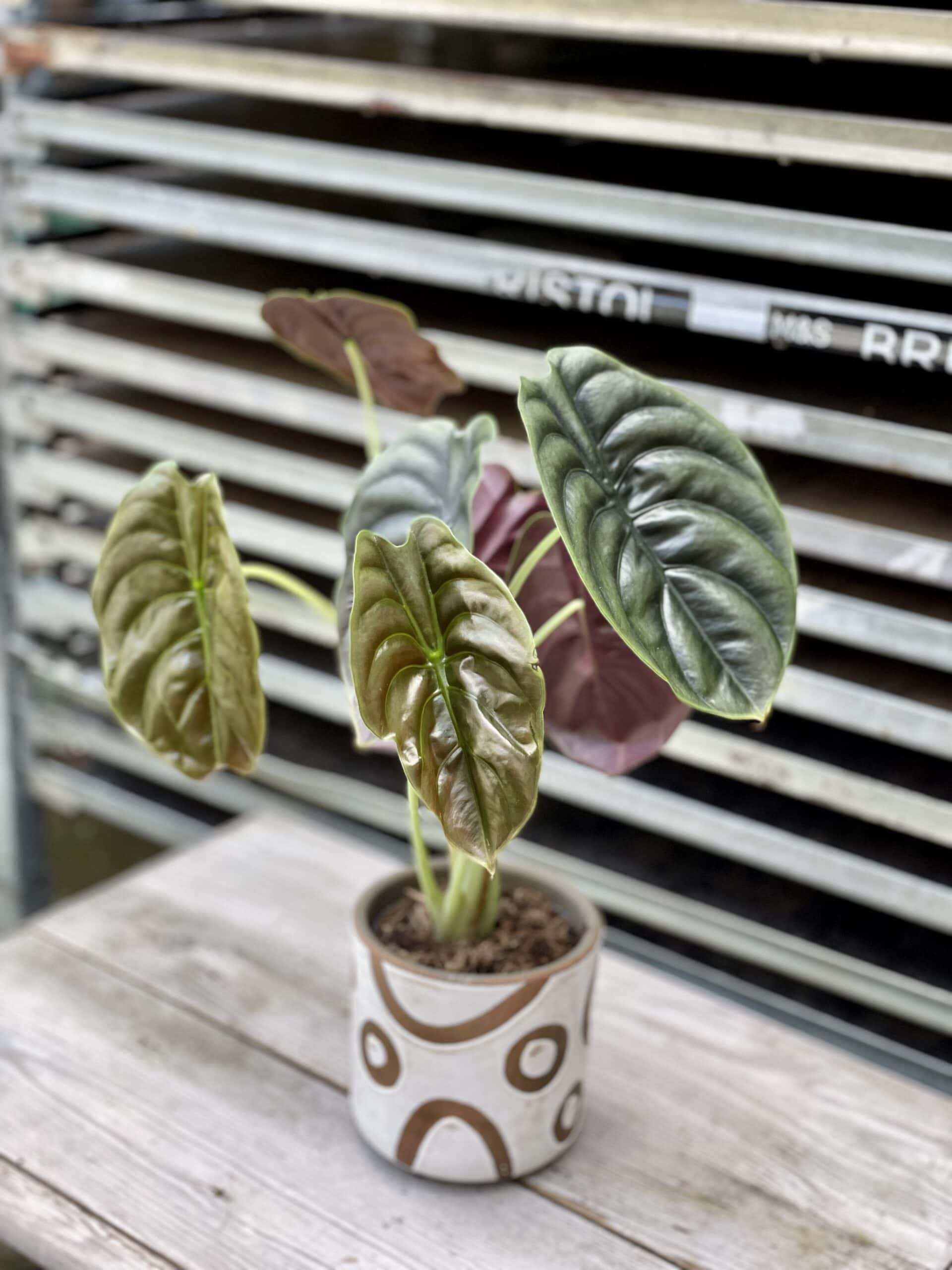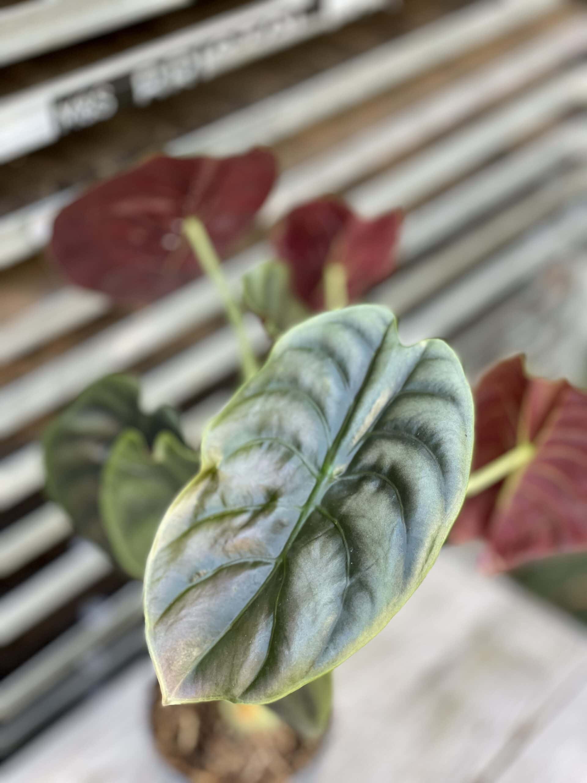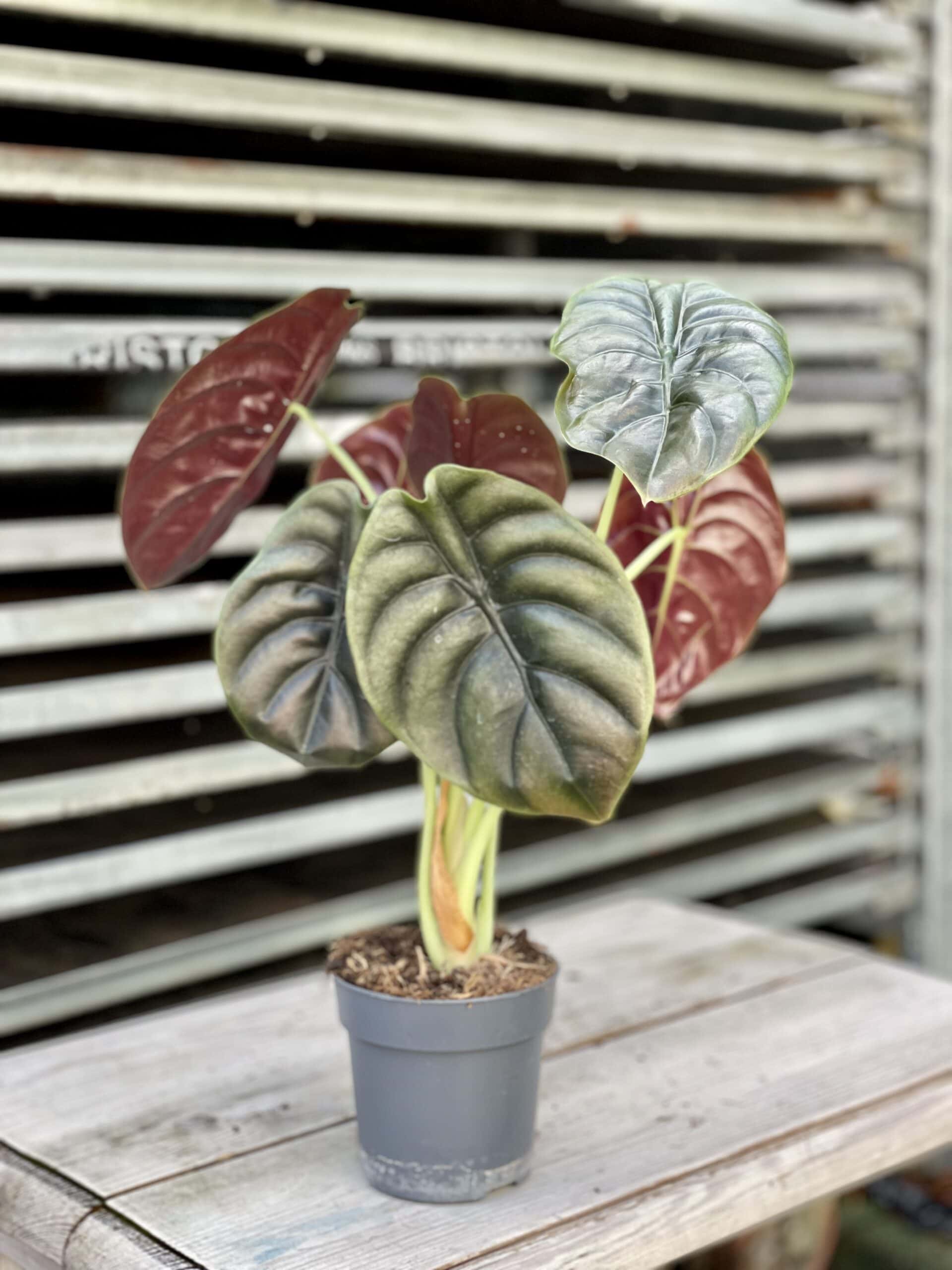 Alocasia Red Secret to widowiskowa, salonowa piękność. Zachwycające są jej lśniące liście – w kolorze głębokiej zieleni, gdzieniegdzie podbarwione purpurą i o falistej, niespotykanej strukturze. Red Secret to zdecydowanie królowa naszej kolekcji Alocasii.
