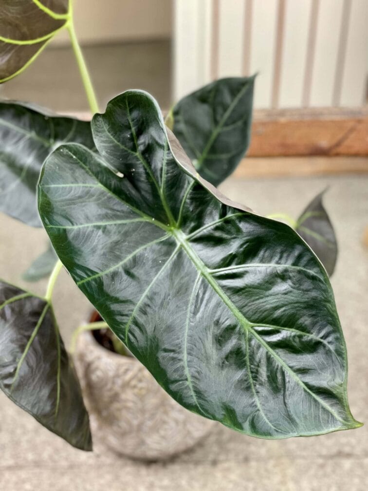 Widoczna na zdjęciu roślina: Alocasia Regal Shields ma wysokość około 35 cm. Jej doniczka ma 15 cm średnicy oraz 15 cm wysokości.