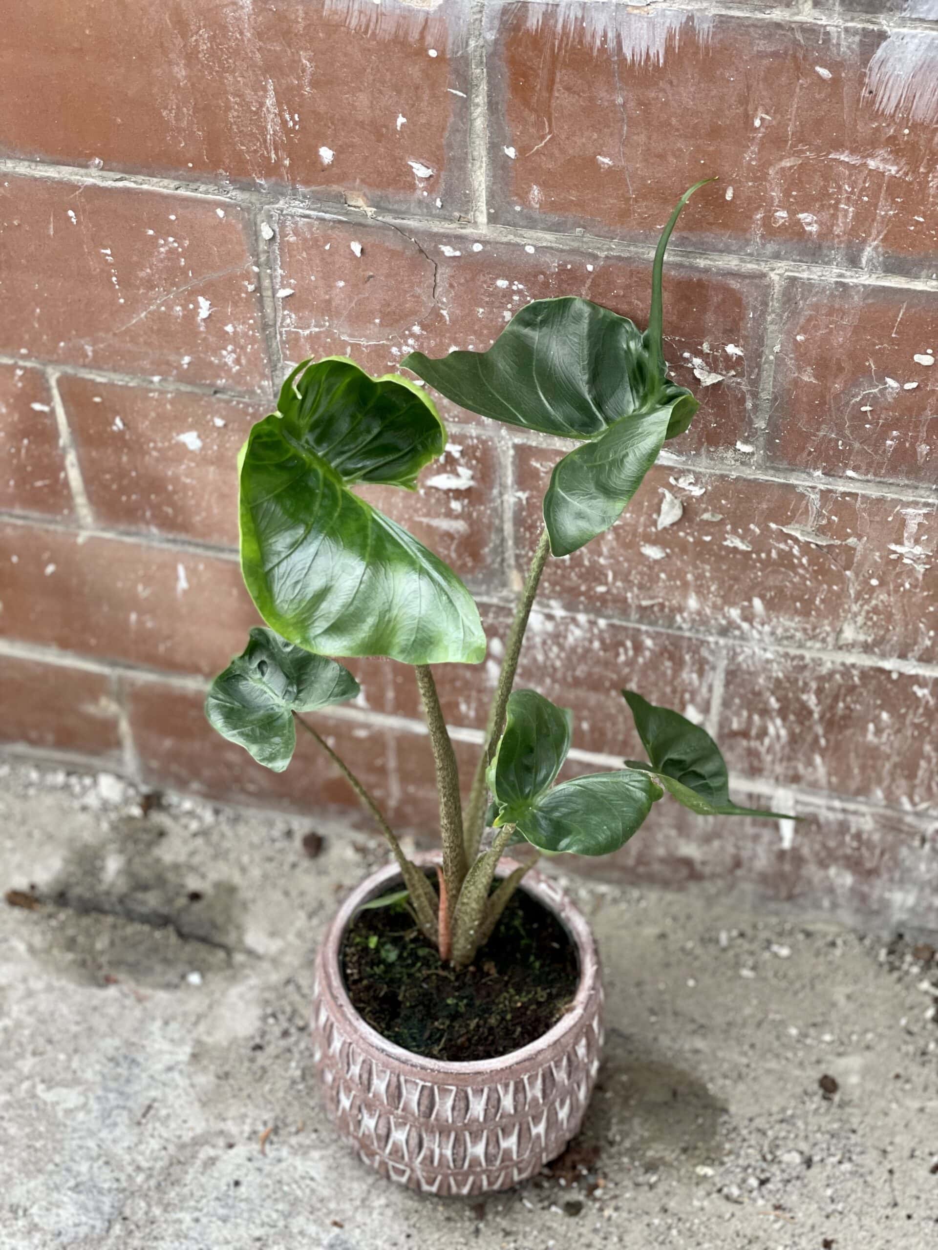 Widoczna na zdjęciu roślina: Alocasia Stingray ma wysokość około 45 cm. Jej doniczka ma 14 cm średnicy oraz 14 cm wysokości.
