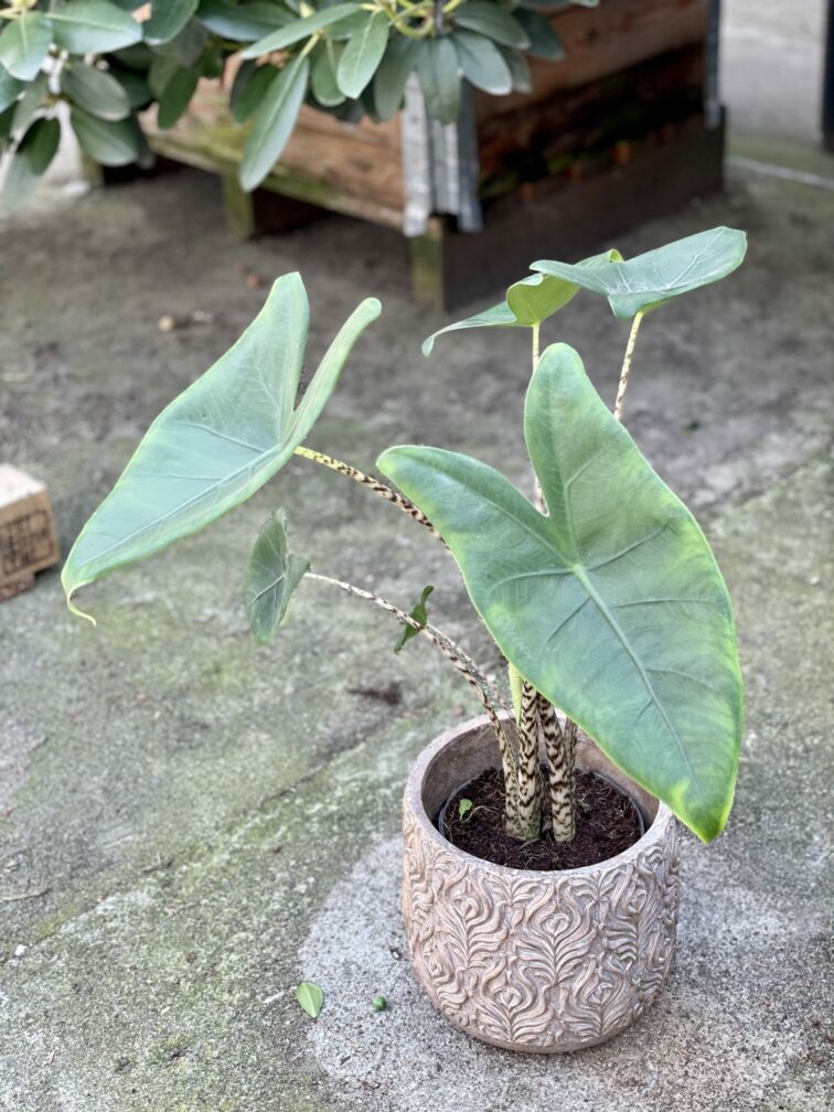 Ta wyjątkowa odmiana Alocasii swą nazwę zawdzięcza oryginalnie wybarwionym łodygom przypominającym pasy zebry.