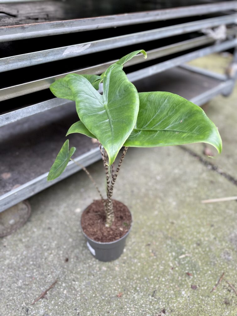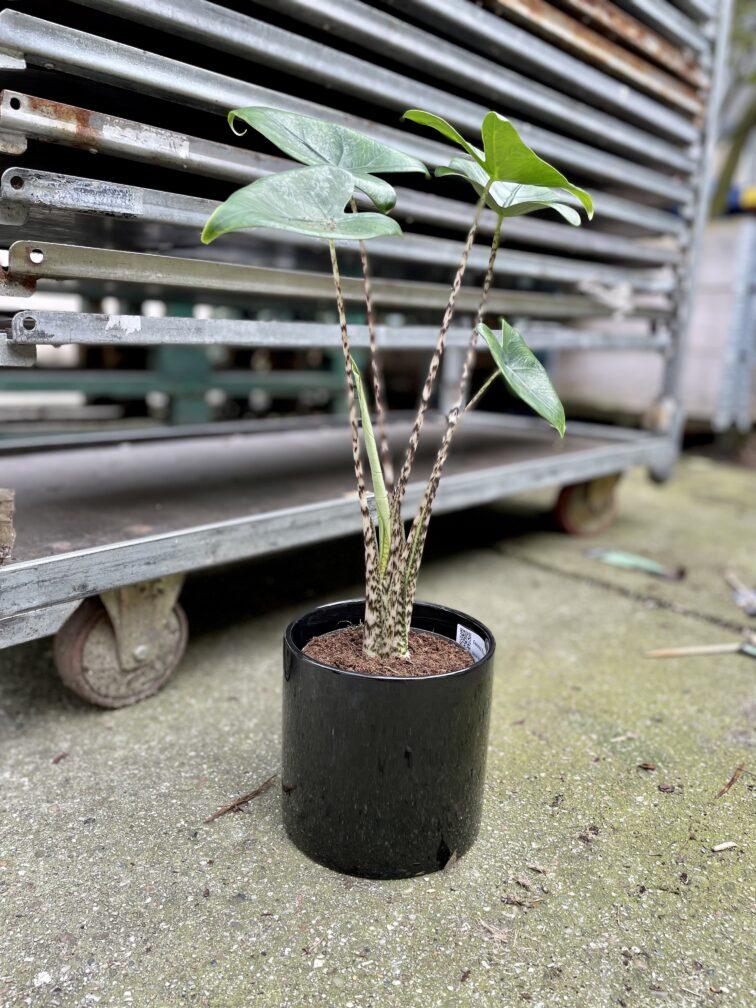 Widoczna na zdjęciu roślina: Alocasia Zebrina ma wysokość około 55 cm. Jej doniczka ma 13 cm średnicy oraz 12 cm wysokości.