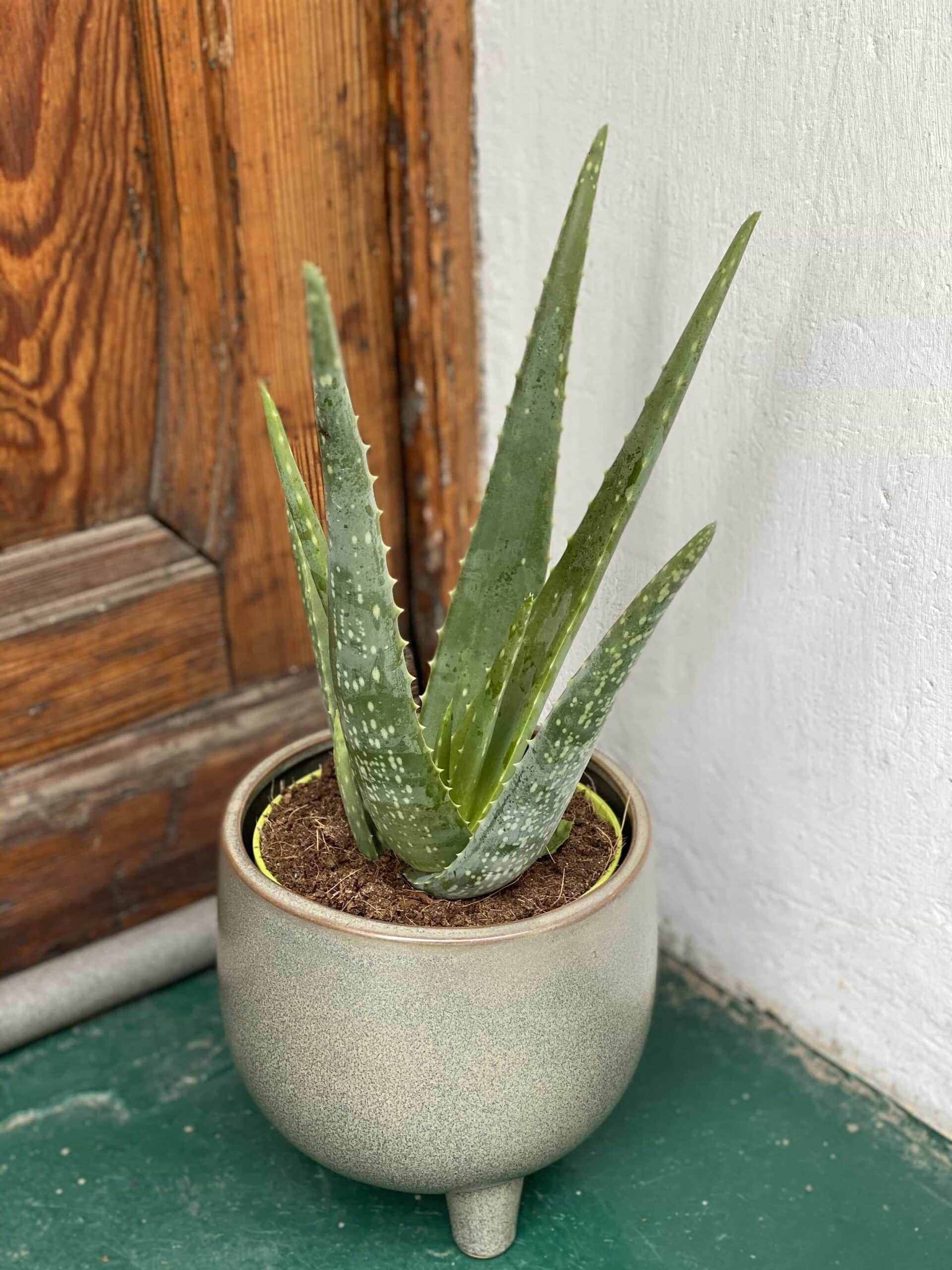 Widoczna na zdjęciu roślina: Aloe Vera ma wysokość około 60 cm. Jej doniczka ma 16 cm średnicy oraz 13 cm wysokości.