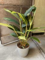 Widoczna na zdjęciu roślina: Alpinia zerumbet variegata ma wysokość około 85 cm. Jej doniczka ma 21 cm średnicy oraz 19 cm wysokości.