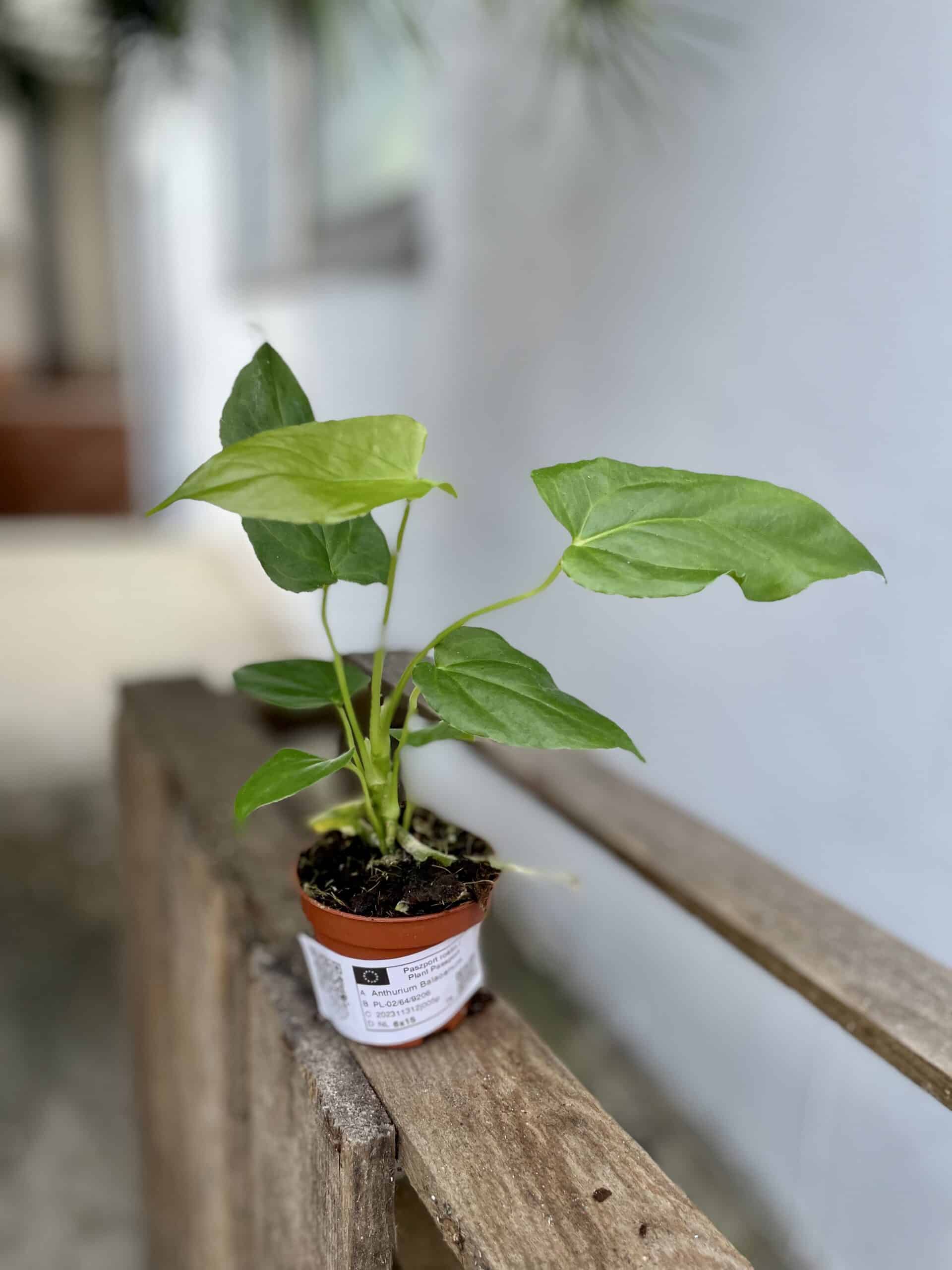 Widoczna na zdjęciu roślina: Anthurium Balaoanum ma wysokość około 15 cm. Jej doniczka ma 6 cm średnicy oraz 5 cm wysokości.