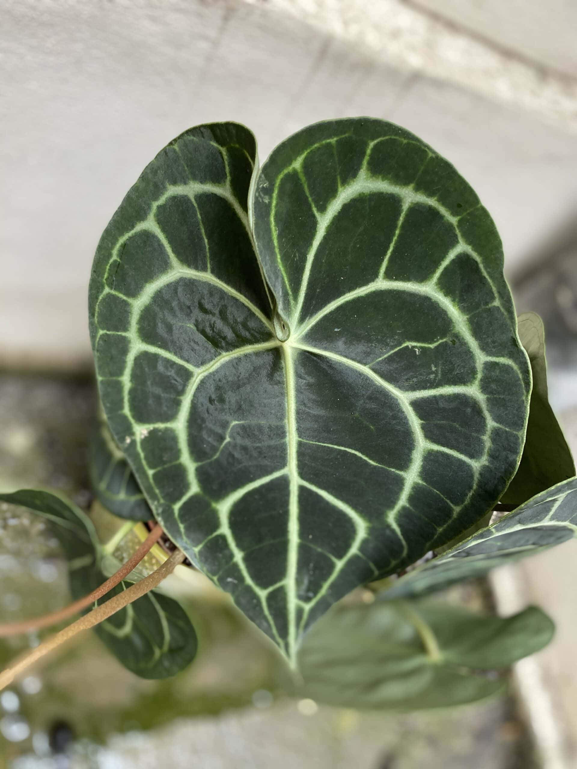 Bardzo rzadkie anthurium, którego ozdobą są sercowate, zamszowe liście w kolorze głębokiej, ciemnej zieleni. Elegancka, nieco mroczna kolorystyka wspaniale kontrastuje z wyrazistym i pięknie rozkrzewiającym się na blaszce liściowej unerwieniem.