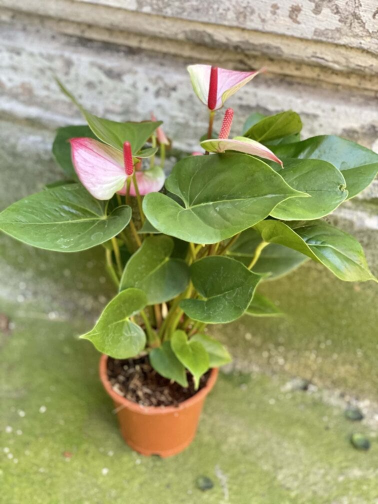 Czarująca odmiana Anthurium o bajecznie wybarwionych kwiatostanach, na których spotykają się biel, róż i zieleń. Liście rośliny mają sercowaty kształt, który nadaje jej dodatkowego uroku.