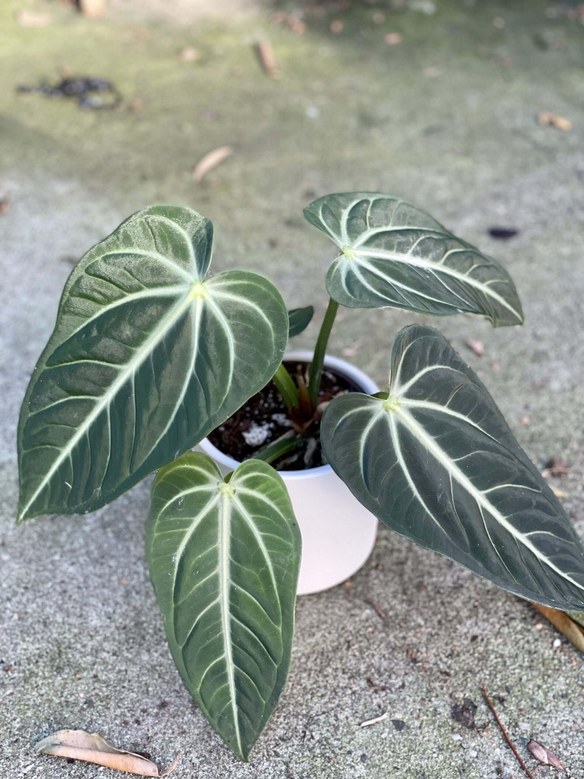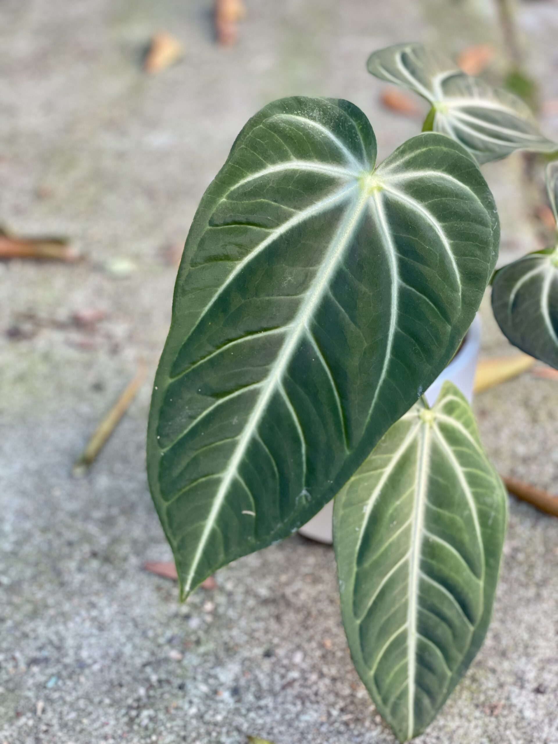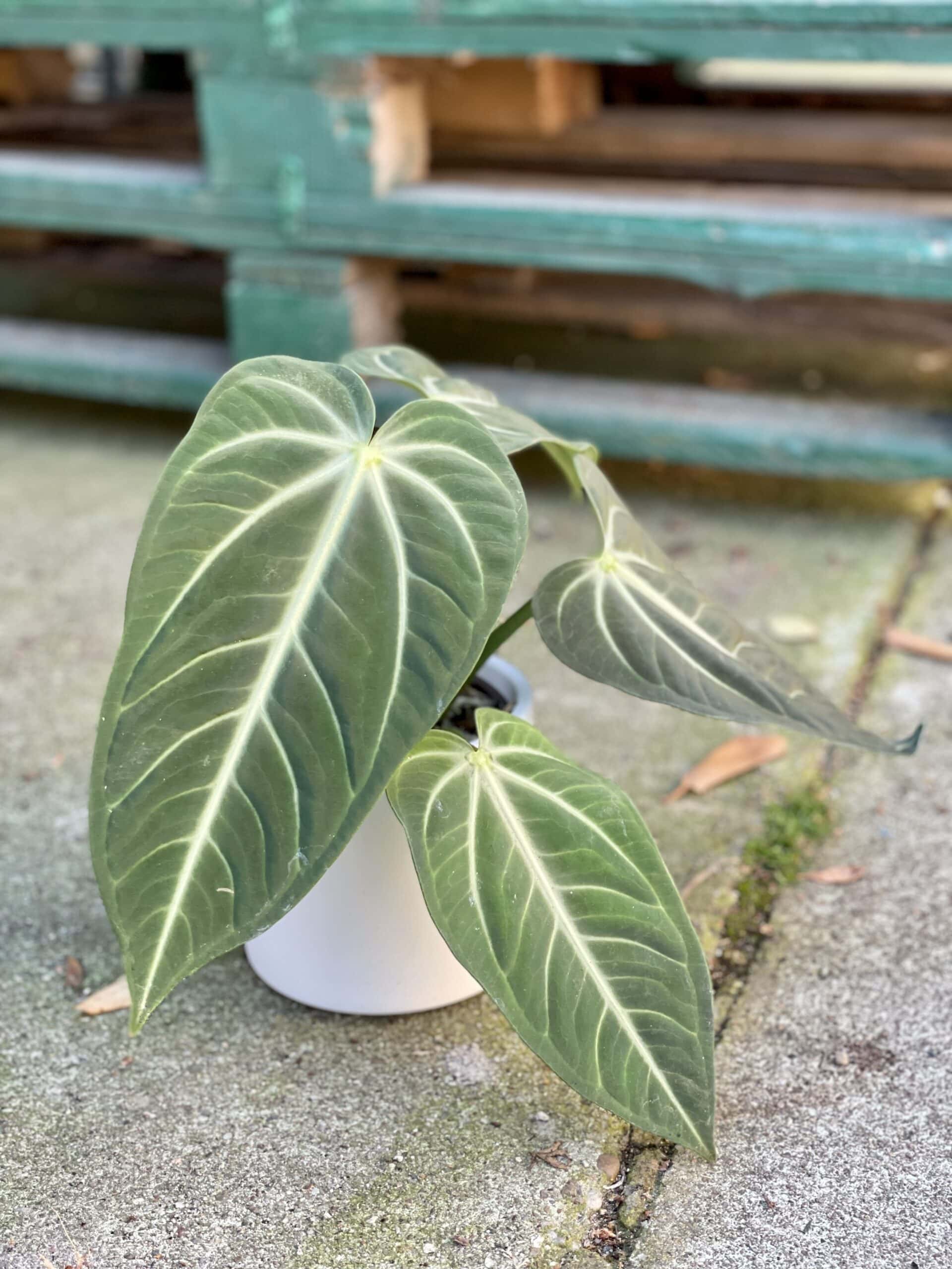 Przepiękna, kolekcjonerska odmiana Anthurium o wydłużonych, aksamitnych liściach i jasnym unerwieniu. Anthurium villenaorum wyróżnia się swoimi trójkątnymi ogonkami i bardziej zwartym pokrojem w porównaniu do popularniejszych odmian anturium.