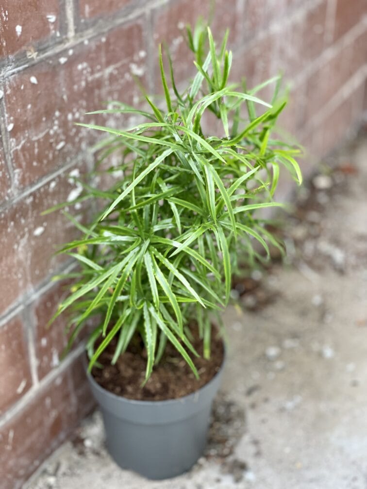 Zwany też Szparagiem Sierpowatym z powodu kształtu liści. W Afryce, skąd pochodzi, osiąga nawet 6 metrów wzrostu. W uprawie domowej będzie mniejszy, ale wciąż na tyle imponujący, by nadać wnętrzu dżunglowy klimat. Doceni letnie wakacje na balkonie lub tarasie.
