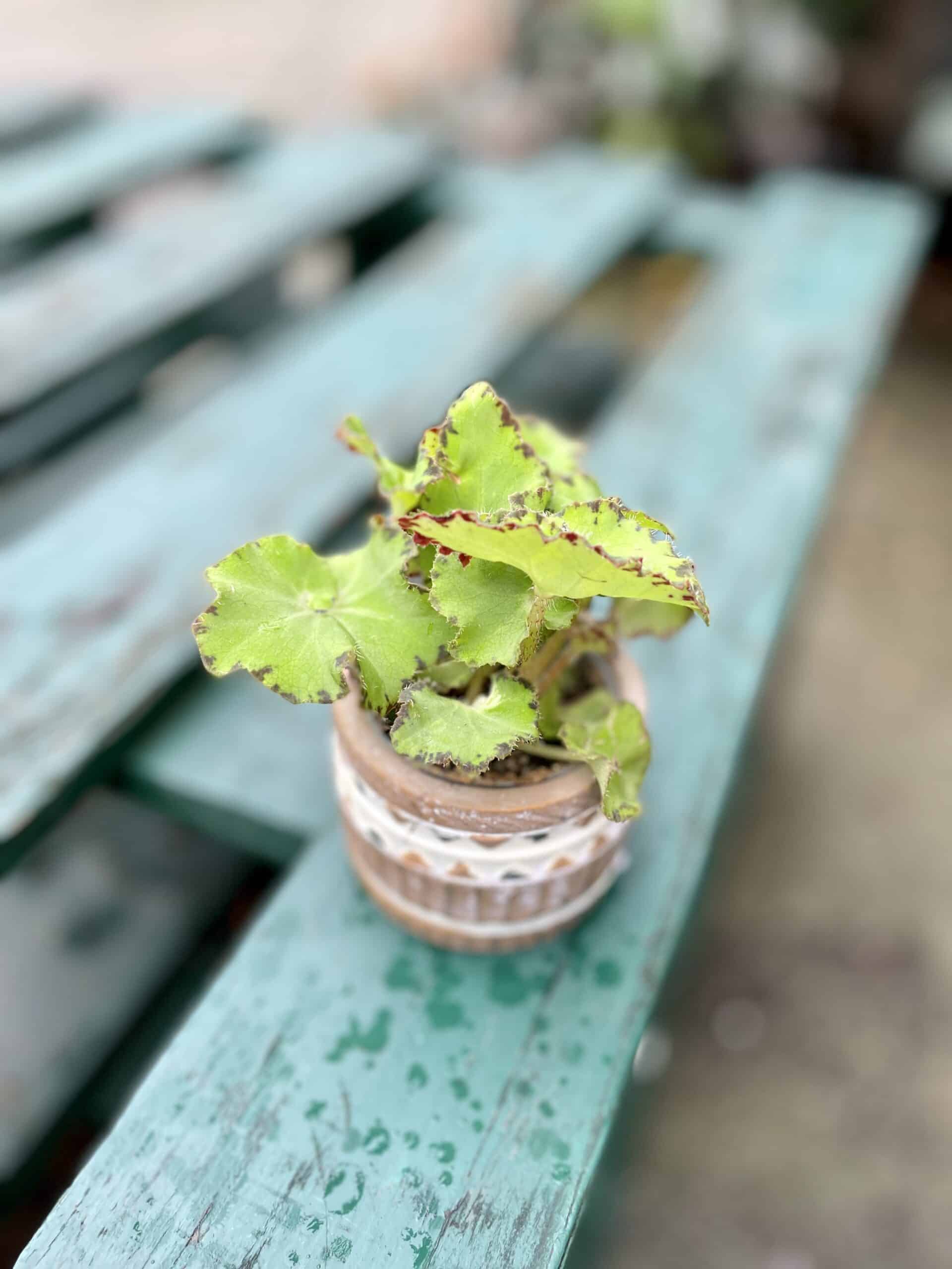Widoczna na zdjęciu roślina: Begonia rex Jive ma wysokość około 10 cm. Jej doniczka ma 6 cm średnicy oraz 6 cm wysokości.