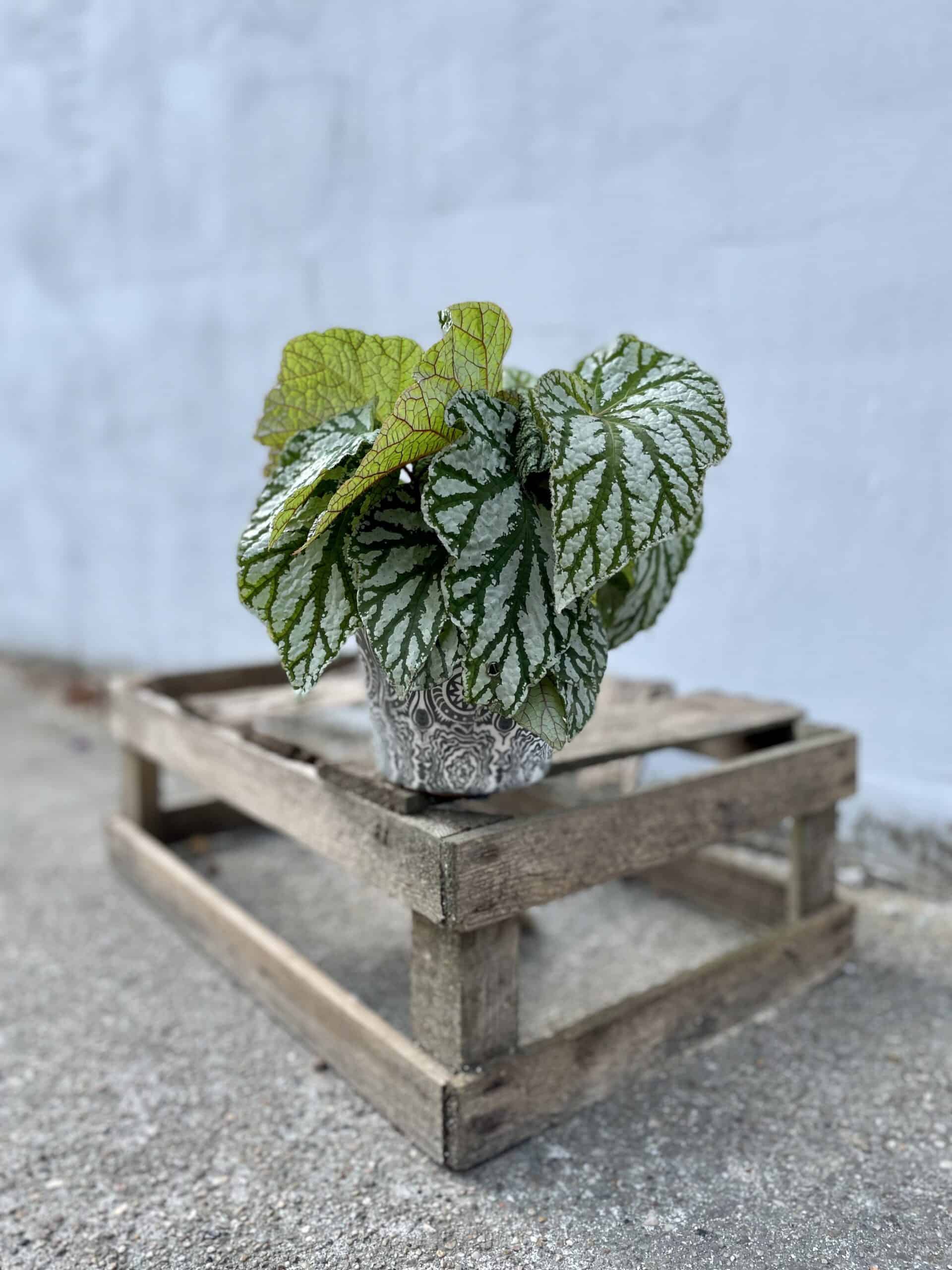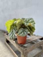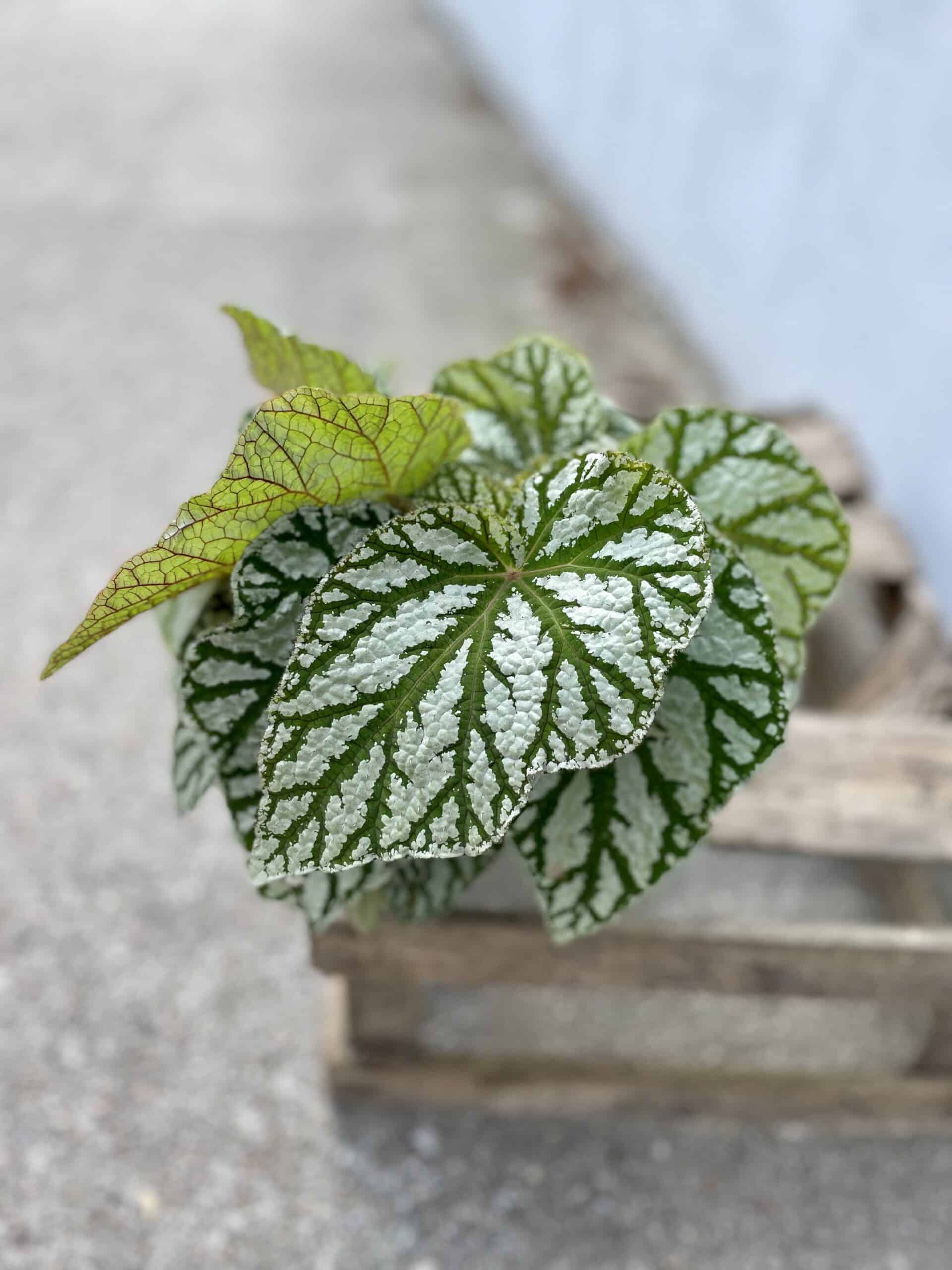 Rzadka odmiana Begonii o wyraźnym, ciemnozielonym unerwieniu, które pięknie kontrastuje z dominującą bielą. Jak wszystkie Begonie jest bardzo dekoracyjna.
