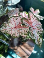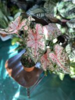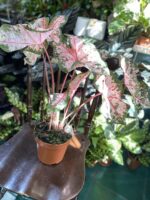 Widoczna na zdjęciu roślina: Caladium Carolyn ma wysokość około 60 cm. Jej doniczka ma 16 cm średnicy oraz 14 cm wysokości.