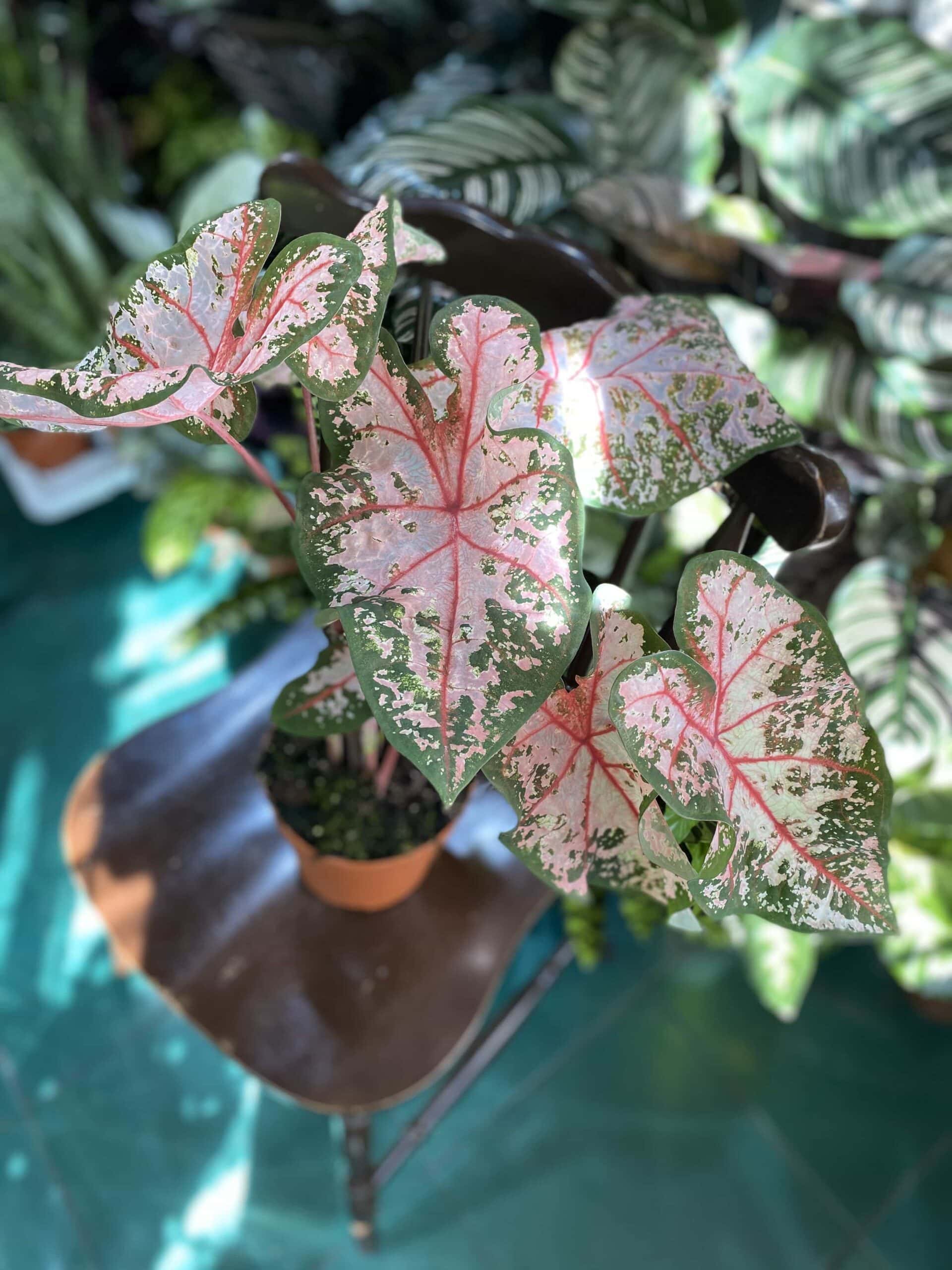 Obłędnie ubarwione Caladium alias Obraźnica. Różowe unerwienie, biel w centrum i nieregularna, zielona obwódka liścia.
