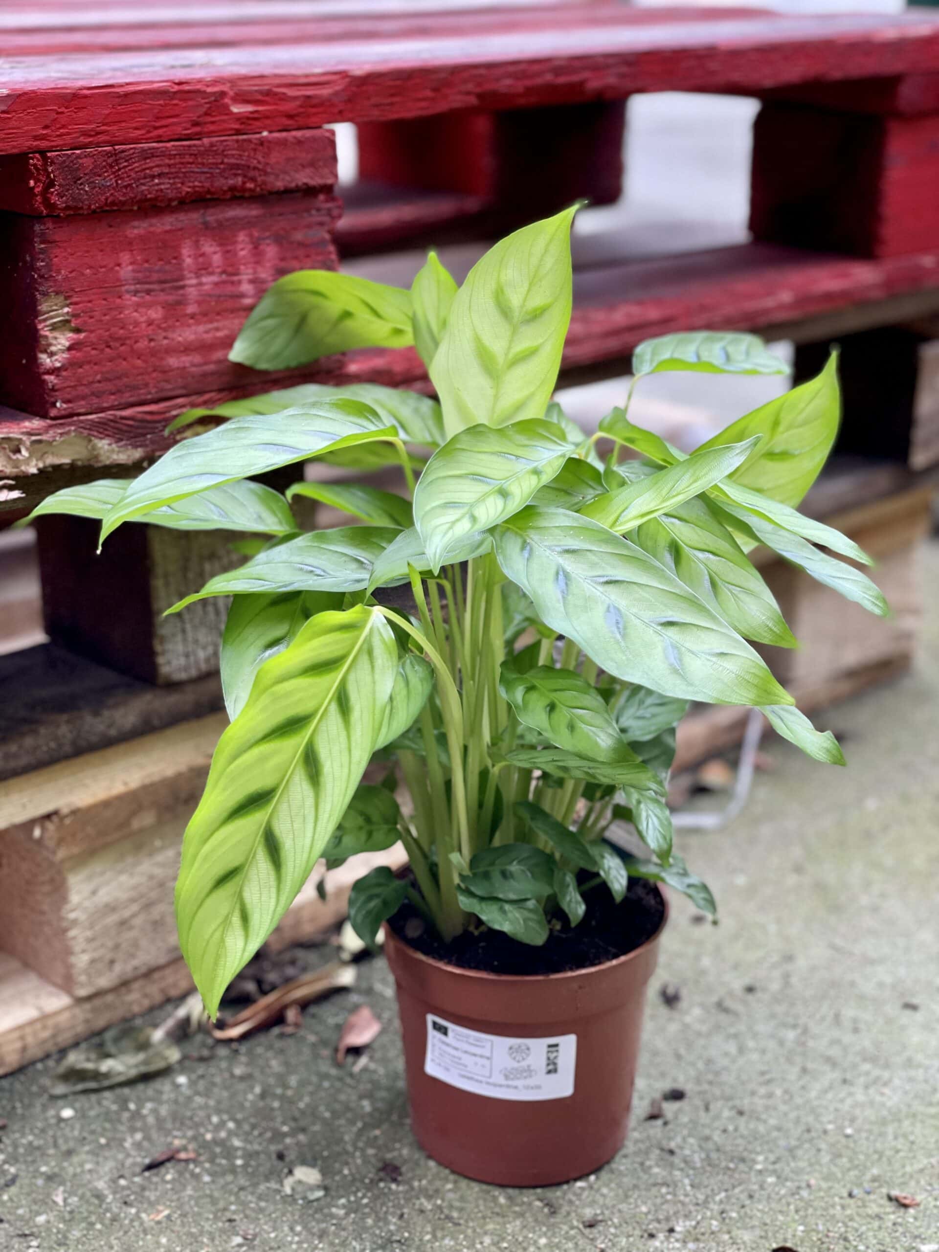 Widoczna na zdjęciu roślina: Calathea Leopardina ma wysokość około 40 cm. Jej doniczka ma 12 cm średnicy oraz 10 cm wysokości.