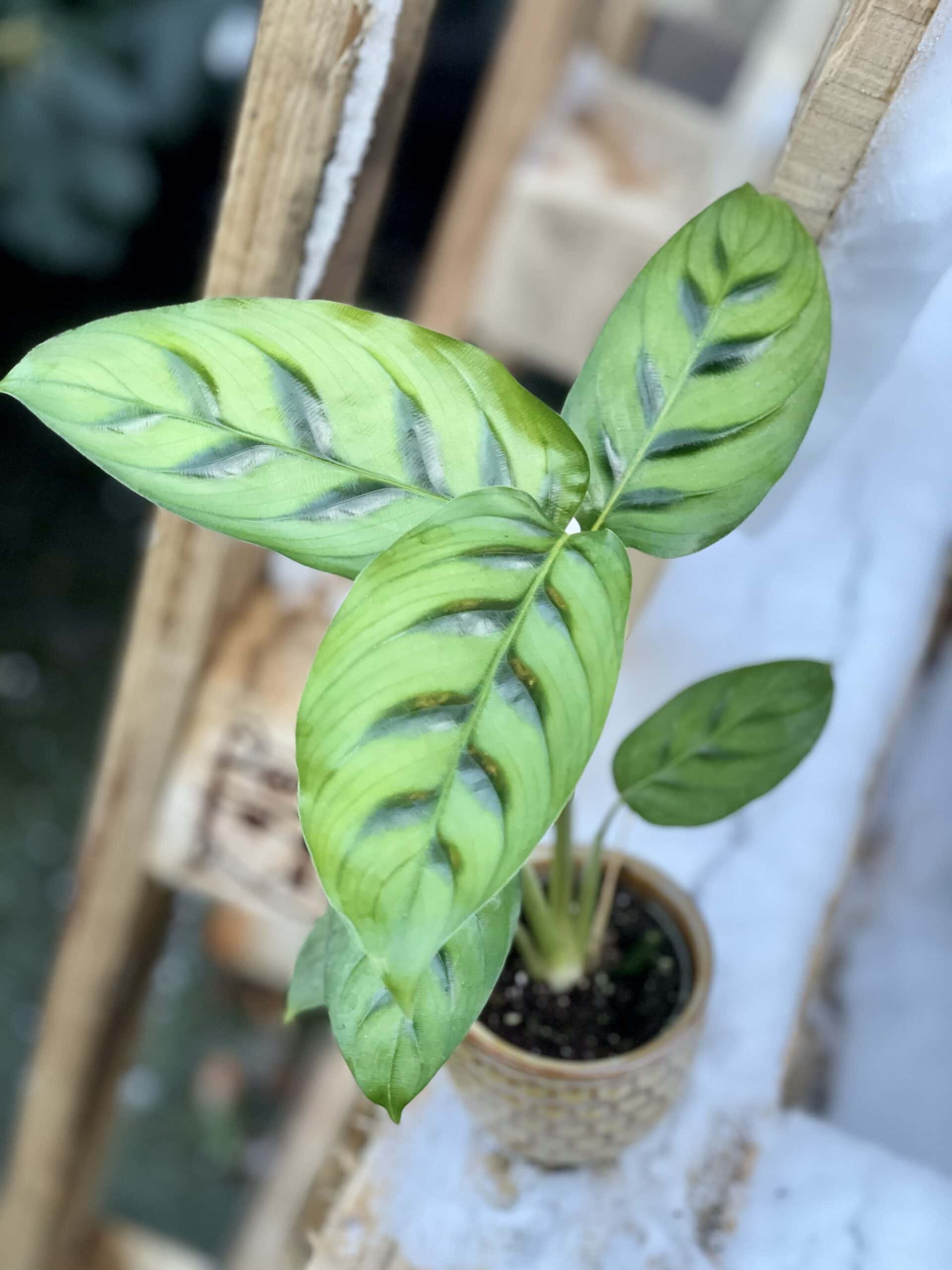 Widoczna na zdjęciu roślina: Calathea Leopardina ma wysokość około 25 cm. Jej doniczka ma 6 cm średnicy oraz 5 cm wysokości.