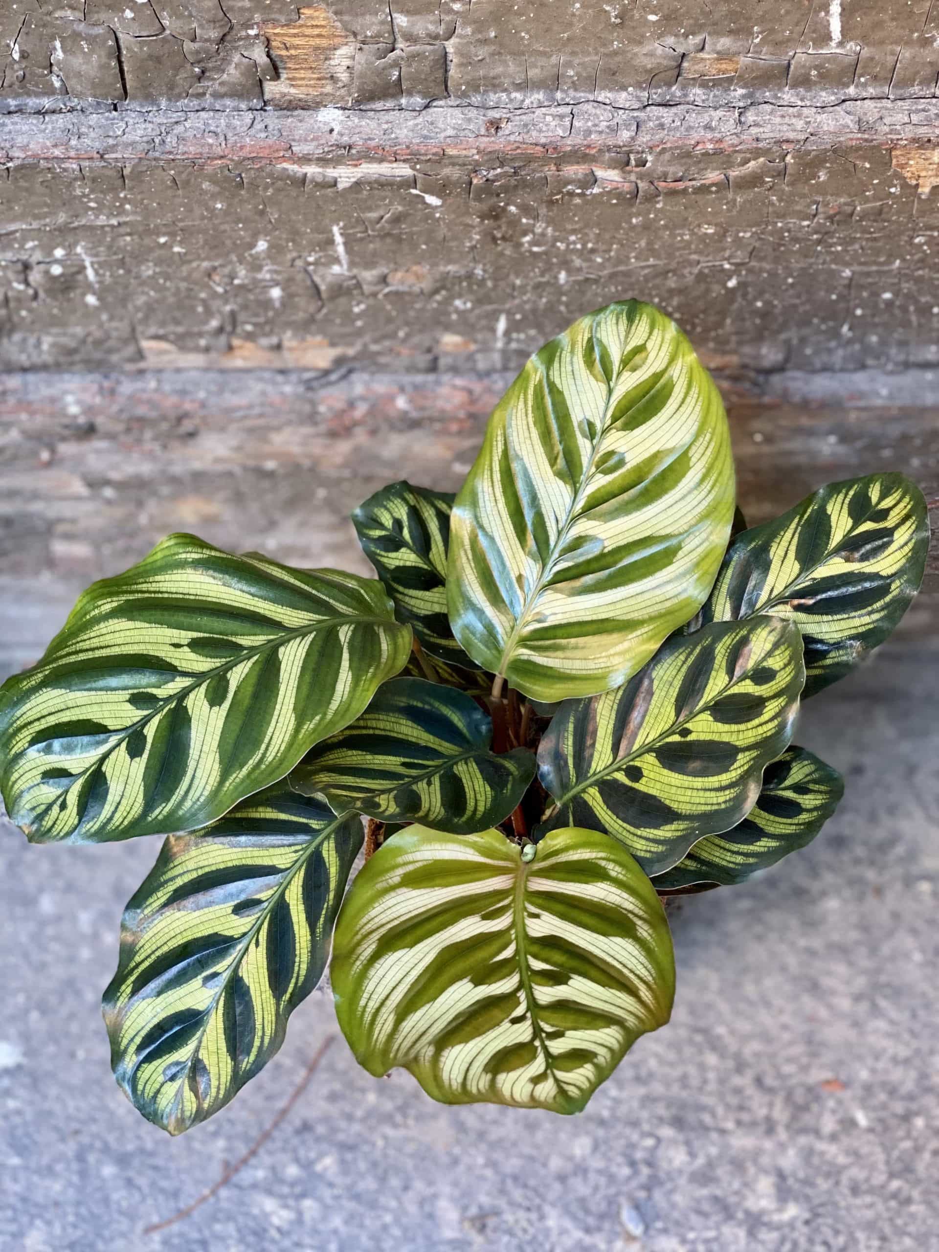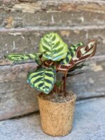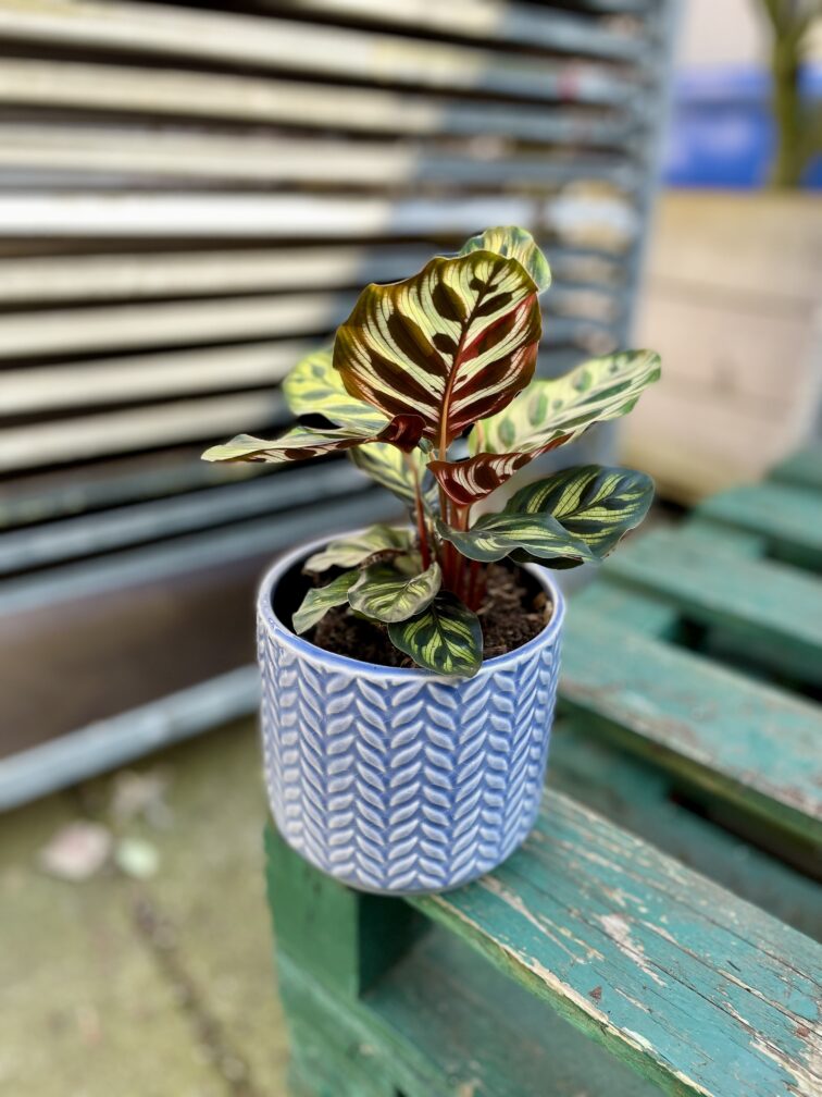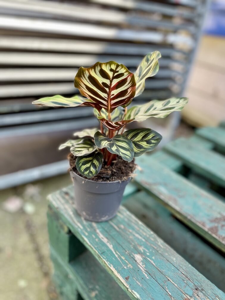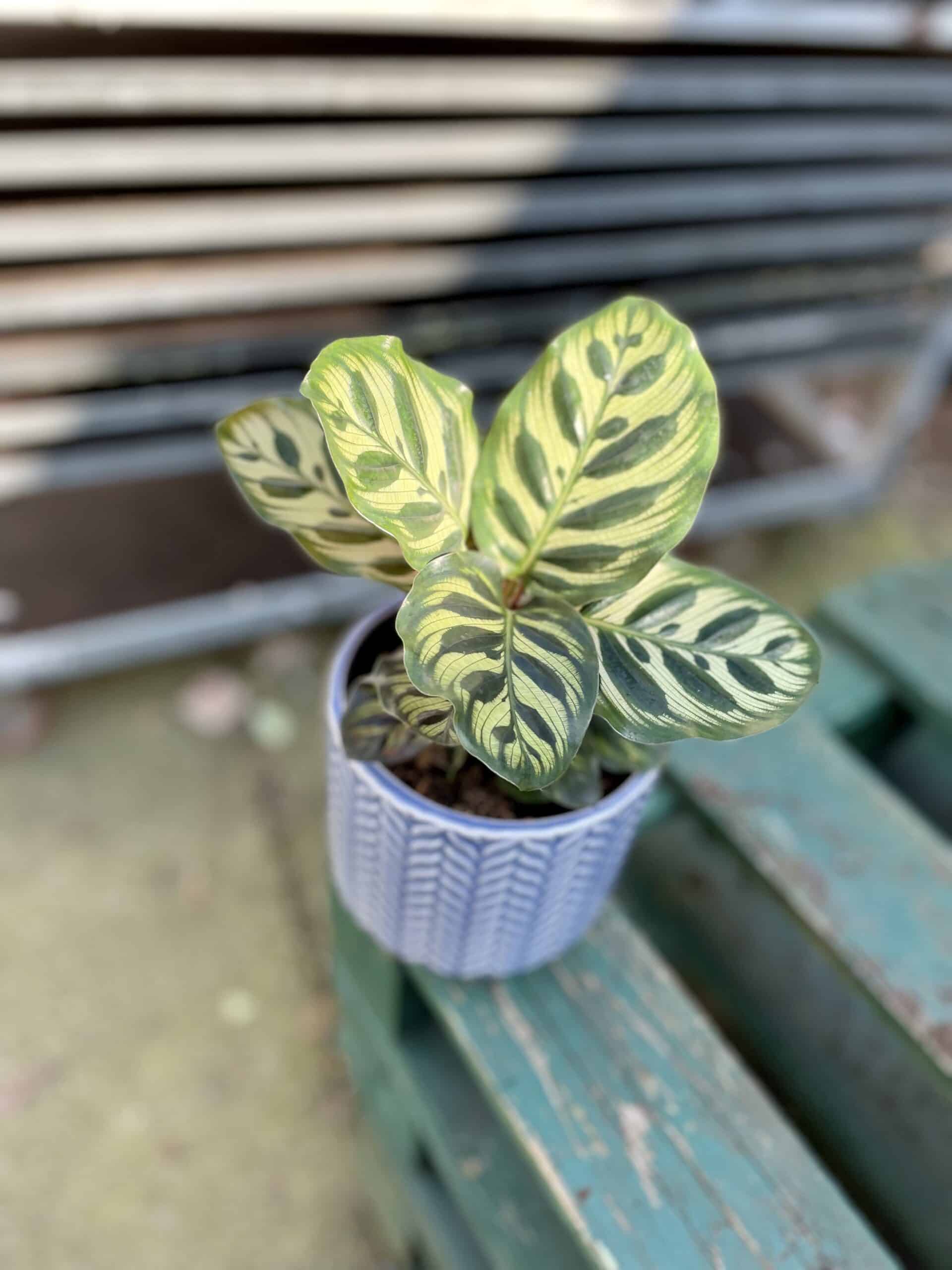 Widoczna na zdjęciu roślina: Calathea makoyana ma wysokość około 25 cm. Jej doniczka ma 10 cm średnicy oraz 11 cm wysokości.