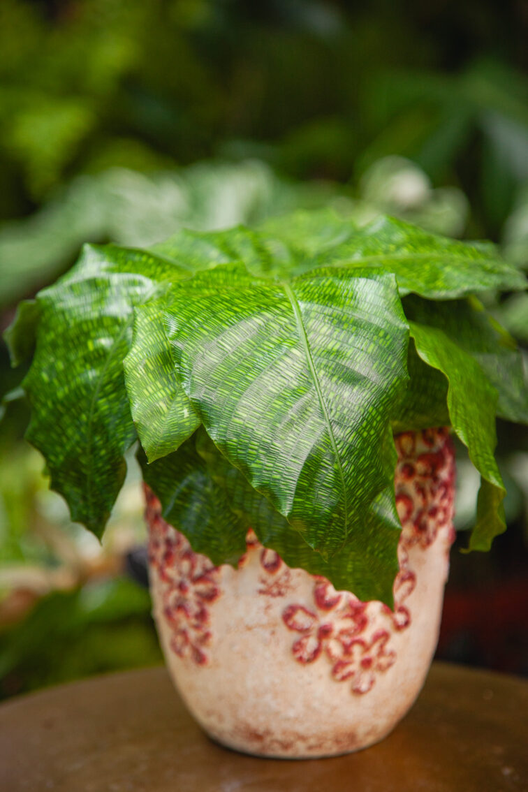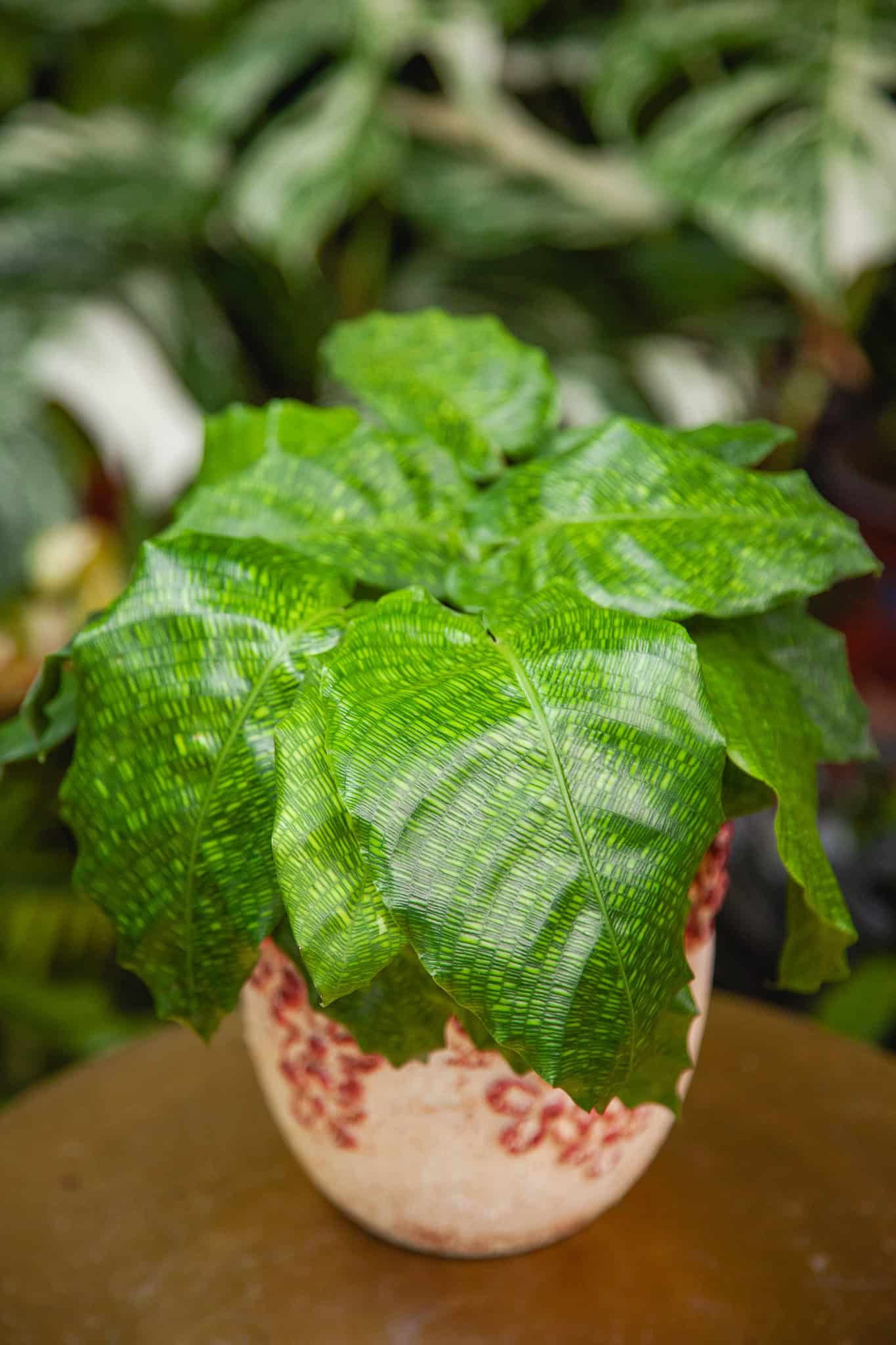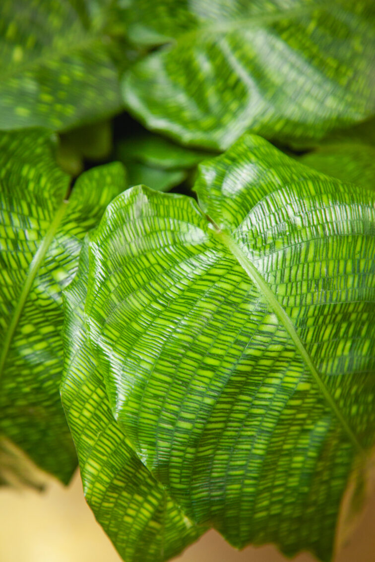 Ta odmiana Calathei urzeka hipnotyzującym wzorem liści układającym się w harmonijną mozaikę. Drobnutkie, zielono żółte prostokąciki tworzą ornamentalną całość, która przypomina siatkę pikseli z pierwszych komputerów albo wzór na skórze jaszczurki czy węża.