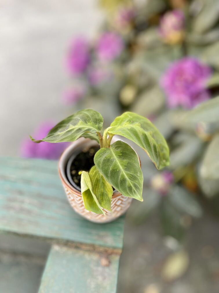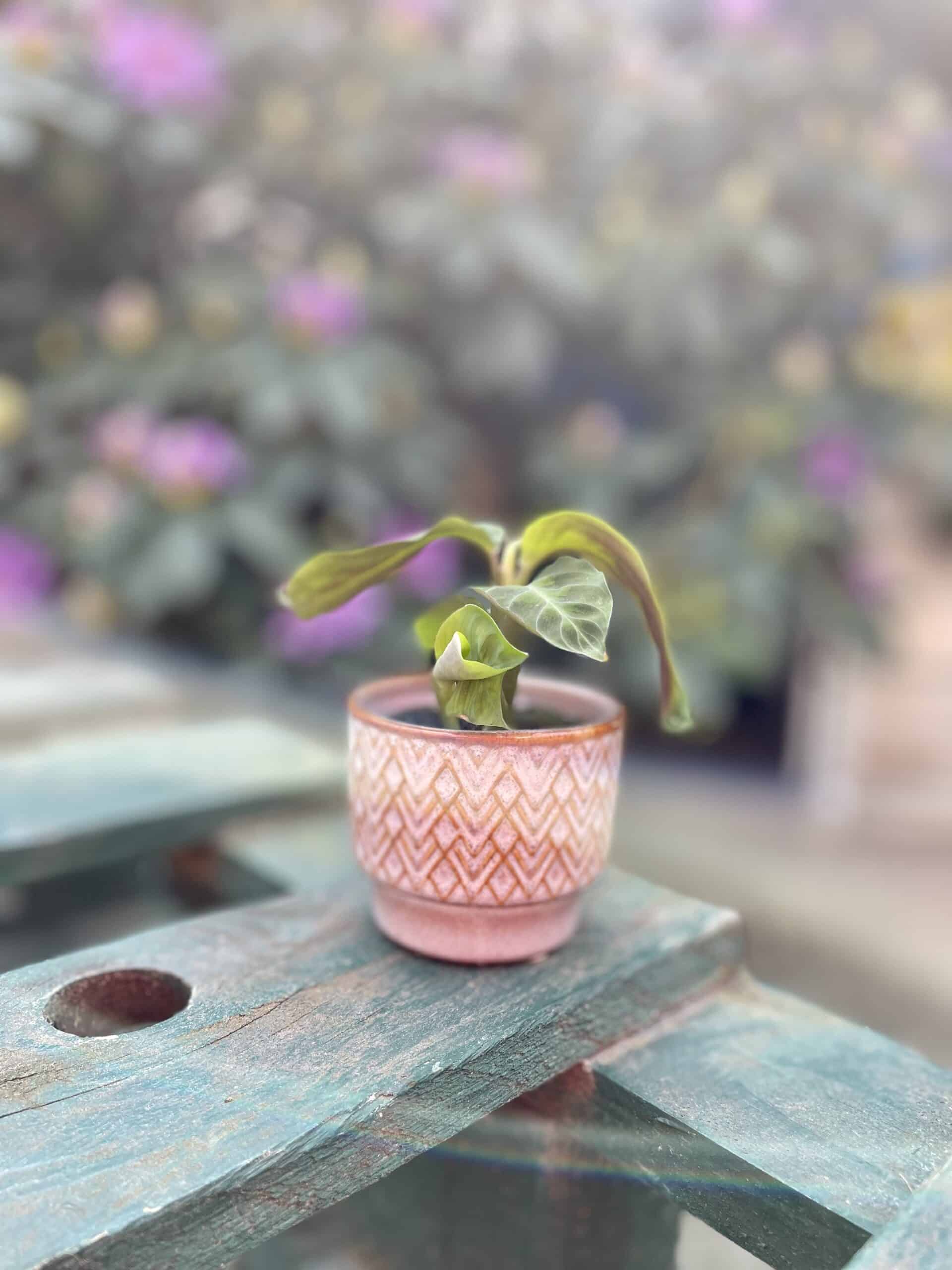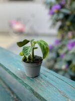 Widoczna na zdjęciu roślina: Calathea warscewiczii ma wysokość około 15 cm. Jej doniczka ma 6 cm średnicy oraz 5 cm wysokości.
