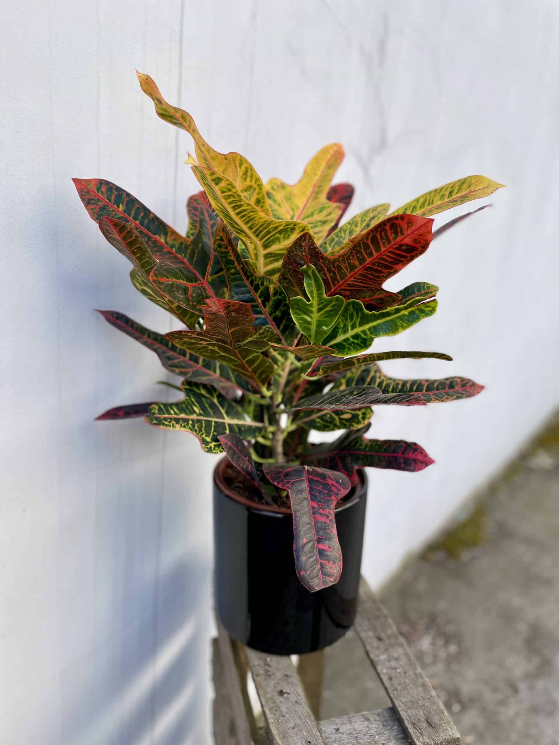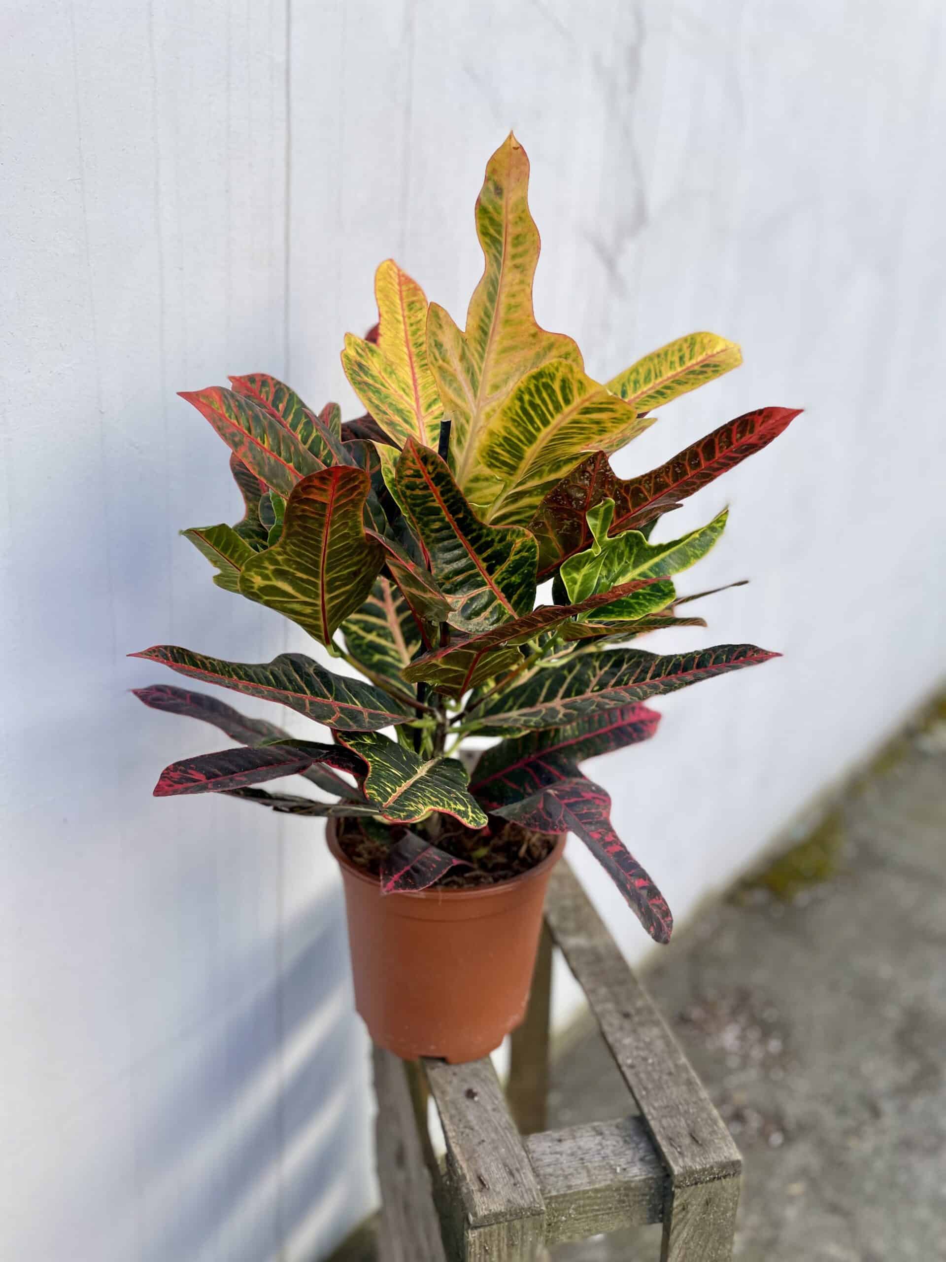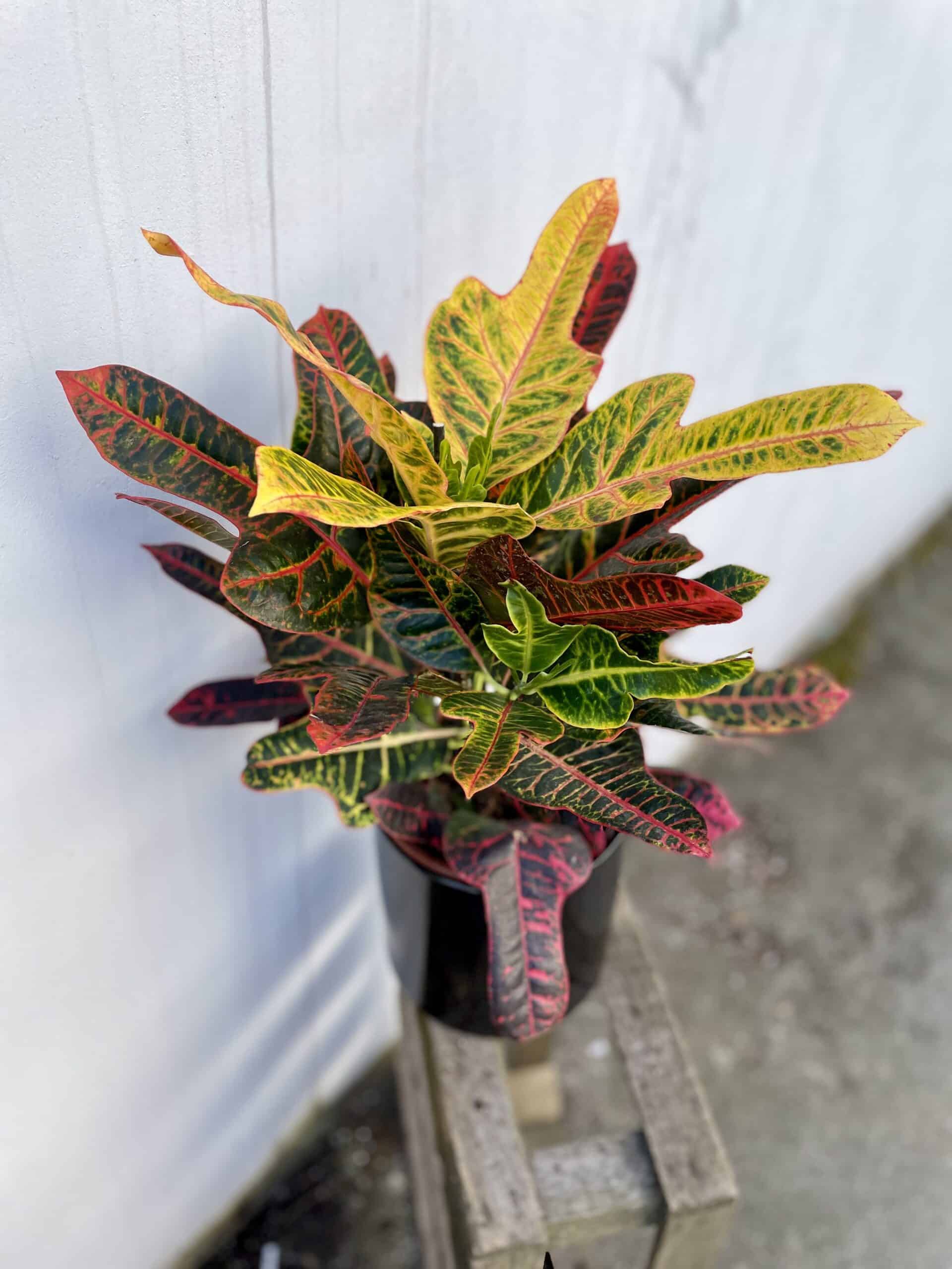 Widoczna na zdjęciu roślina: Codiaeum variegatum Excellent ma wysokość około 55 cm. Jej doniczka ma 19 cm średnicy oraz 16 cm wysokości.