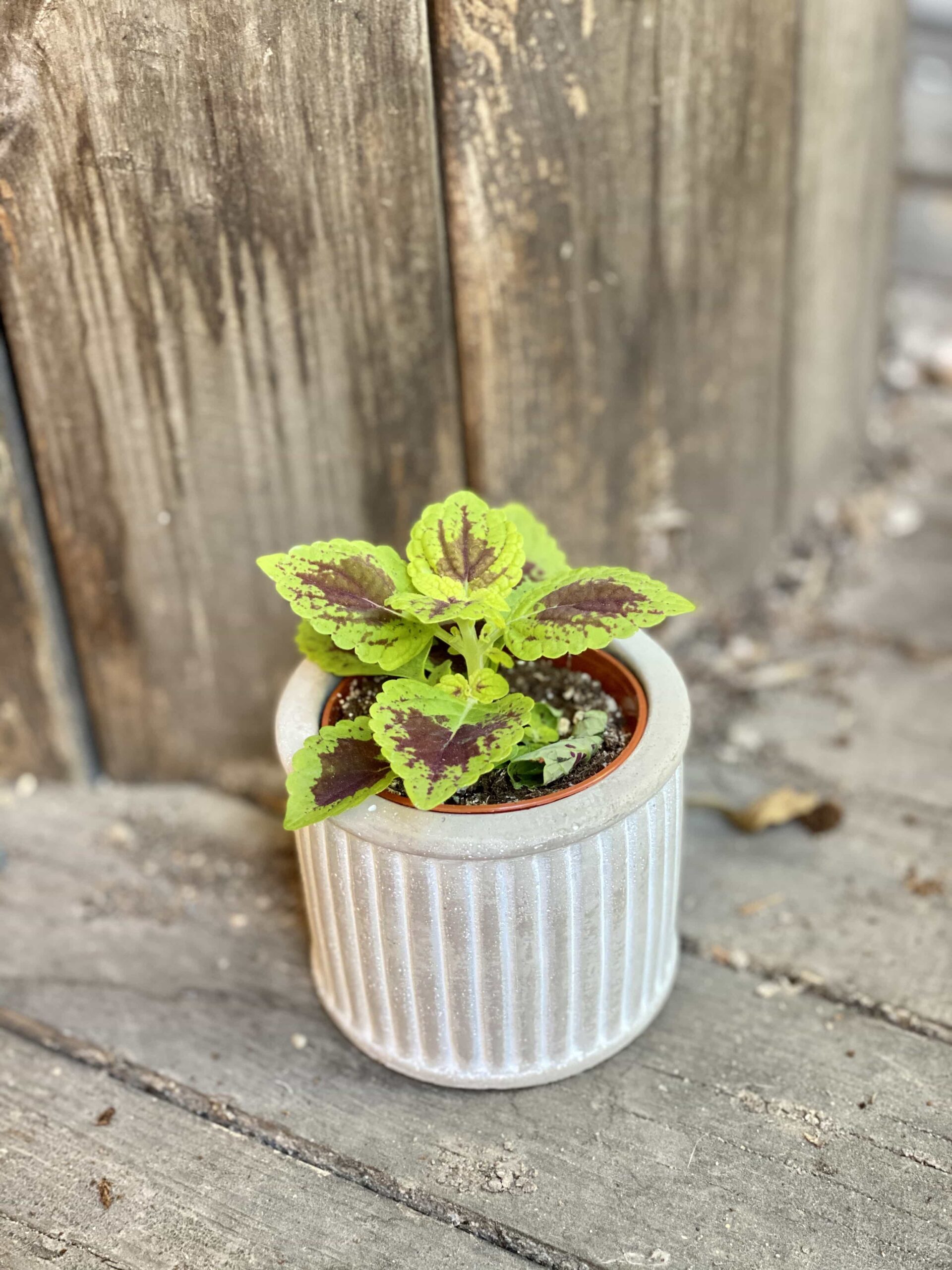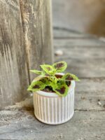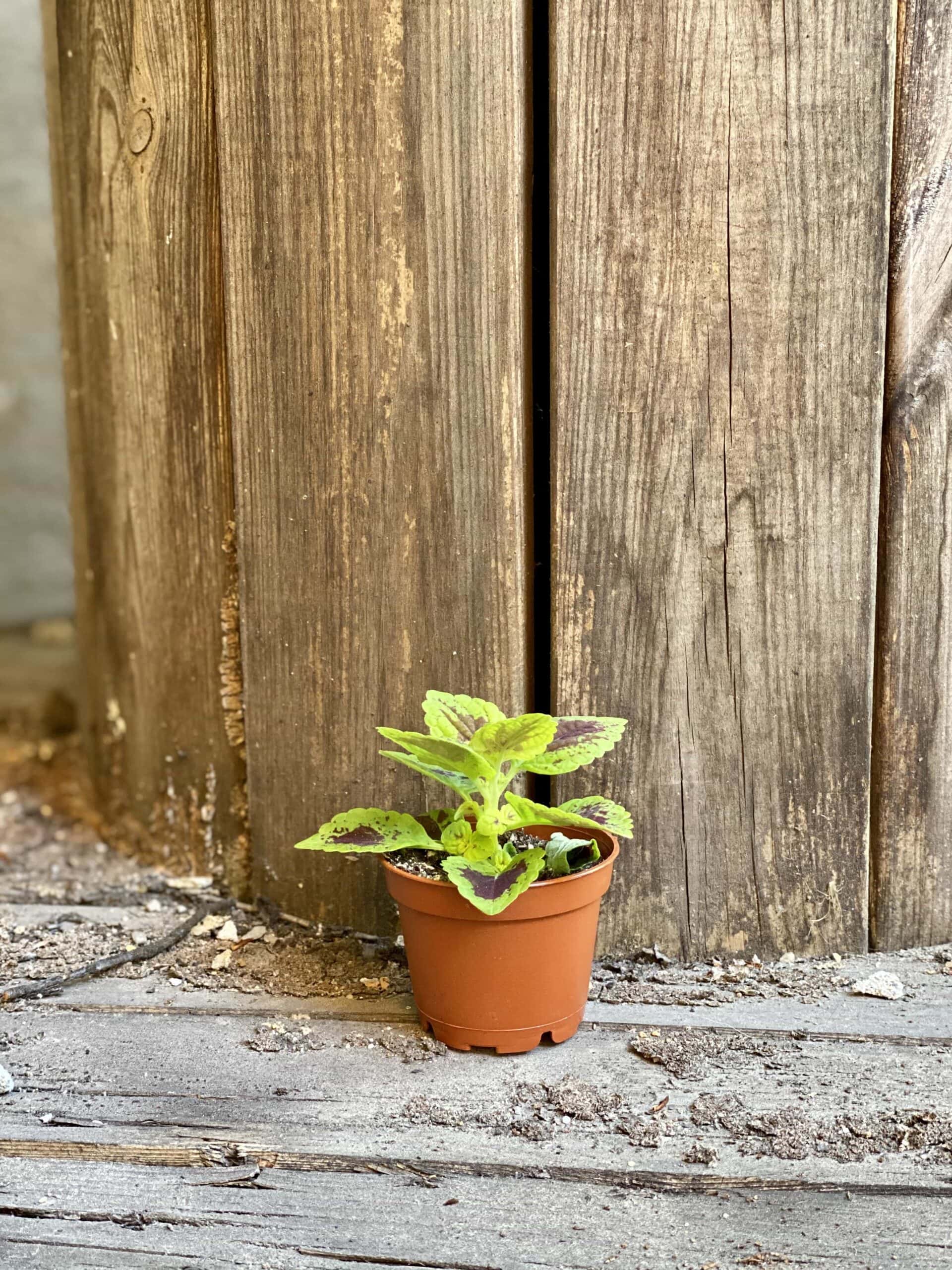 Widoczna na zdjęciu roślina: Coleus Alligator Valley ma wysokość około 8 cm. Jej doniczka ma 6 cm średnicy oraz 5 cm wysokości.