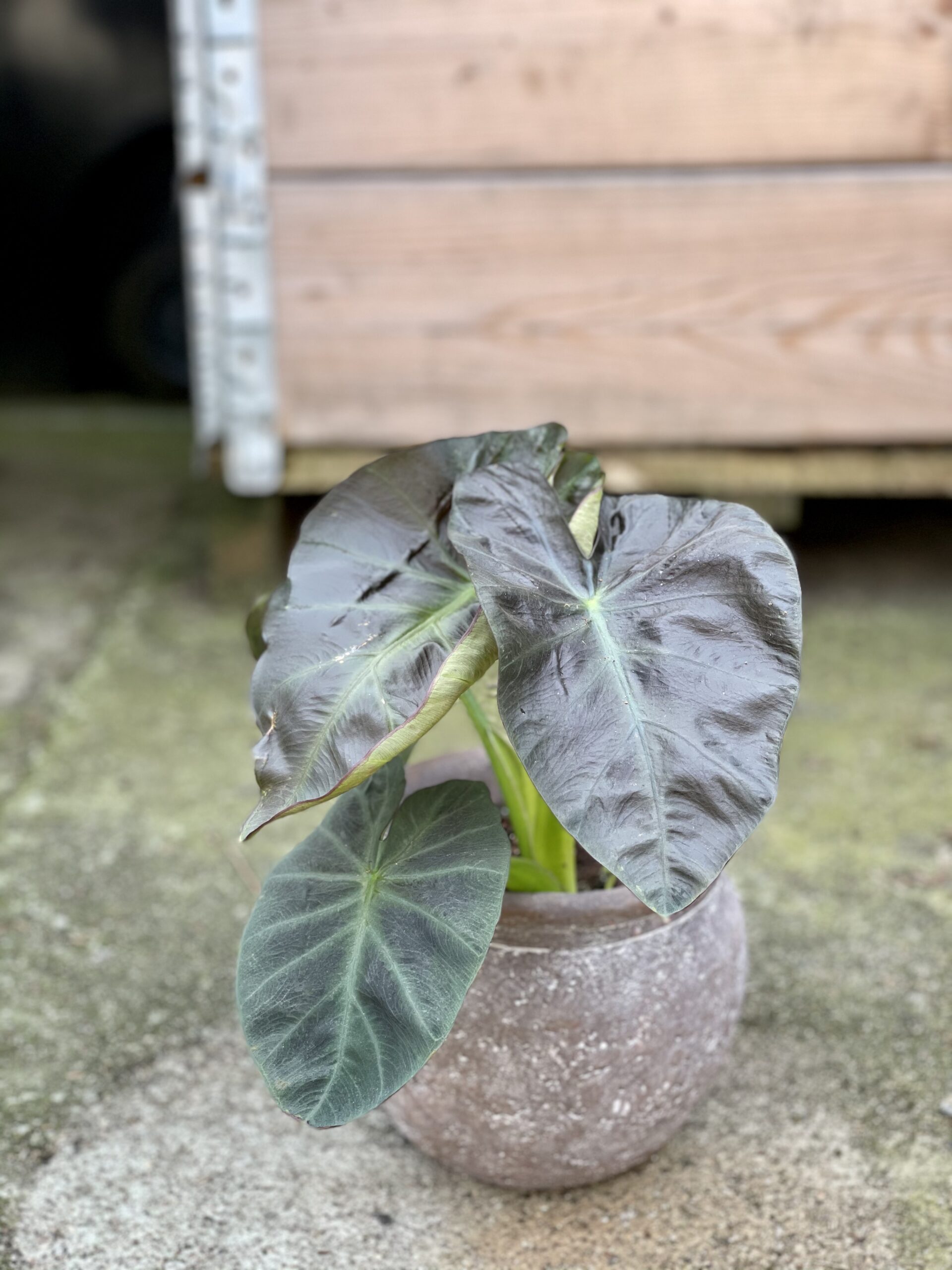 Widoczna na zdjęciu roślina: Colocasia esculenta Cintho Aloha ma wysokość około 45 cm. Jej doniczka ma 13 cm średnicy oraz 13 cm wysokości.