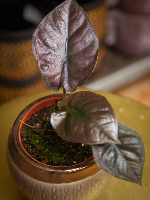 Rzadko spotykana Colocasia o wspaniałym wybarwieniu. Ciemne, zamaszyste liście rozjaśnia neonowo zielony nerw główny. Podobnie jak wszystkie Colocasie „Esculenta” (jadalne), jej bulwa jest cenionym składnikiem kuchni wysp Pacyfiku. Aby Colocasia Cintho Aloha cieszyła nas przez lata musimy zapewnić jej podwyższoną wilgotność powietrza. Ta tropikalna piękność jest wrażliwa na przesuszenie. Należy ją nawozić i dopieszczać, a po zakupie przesadzić w przepuszczalne, lekkie podłoże.