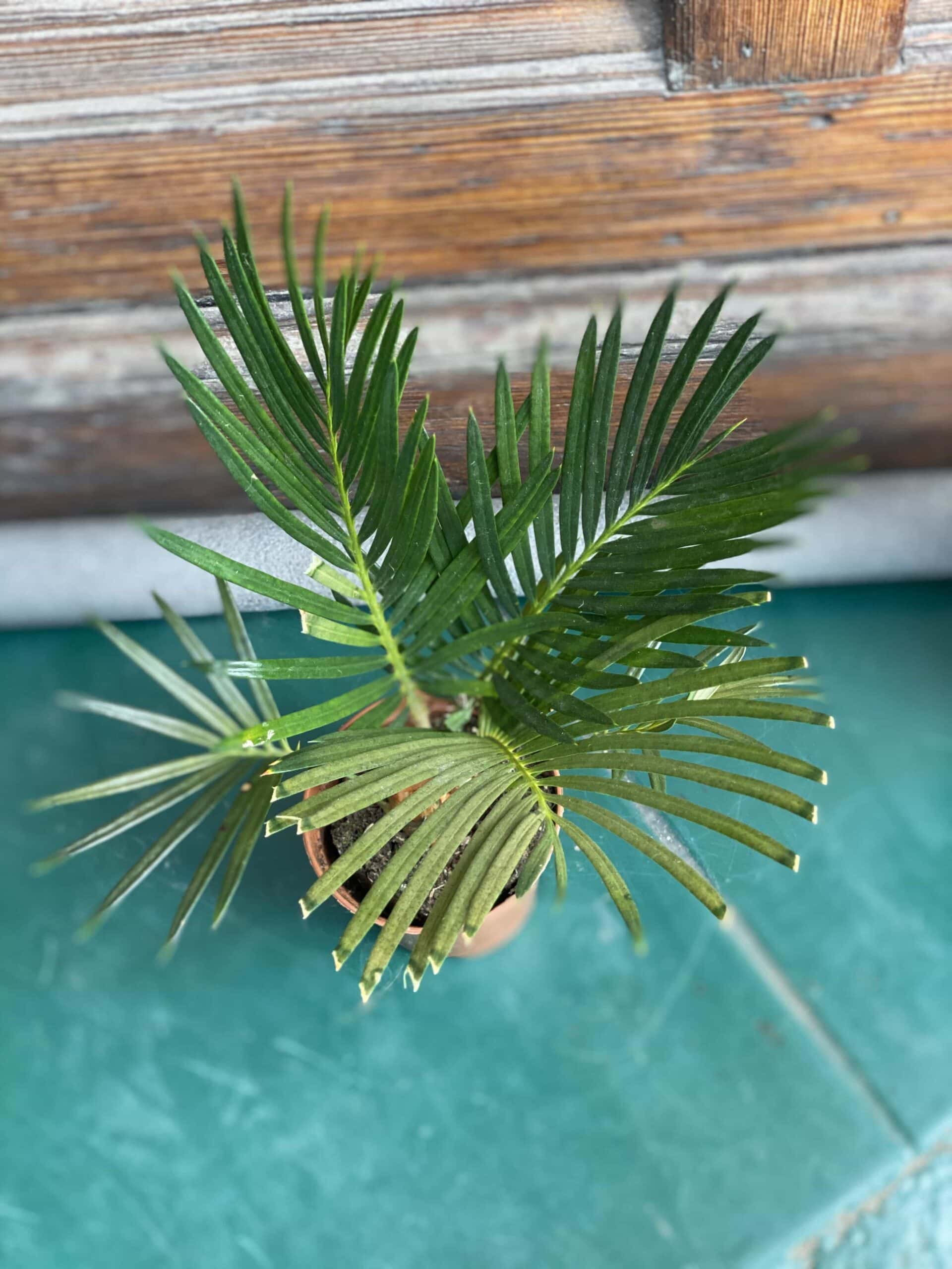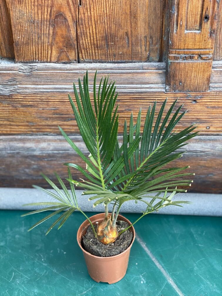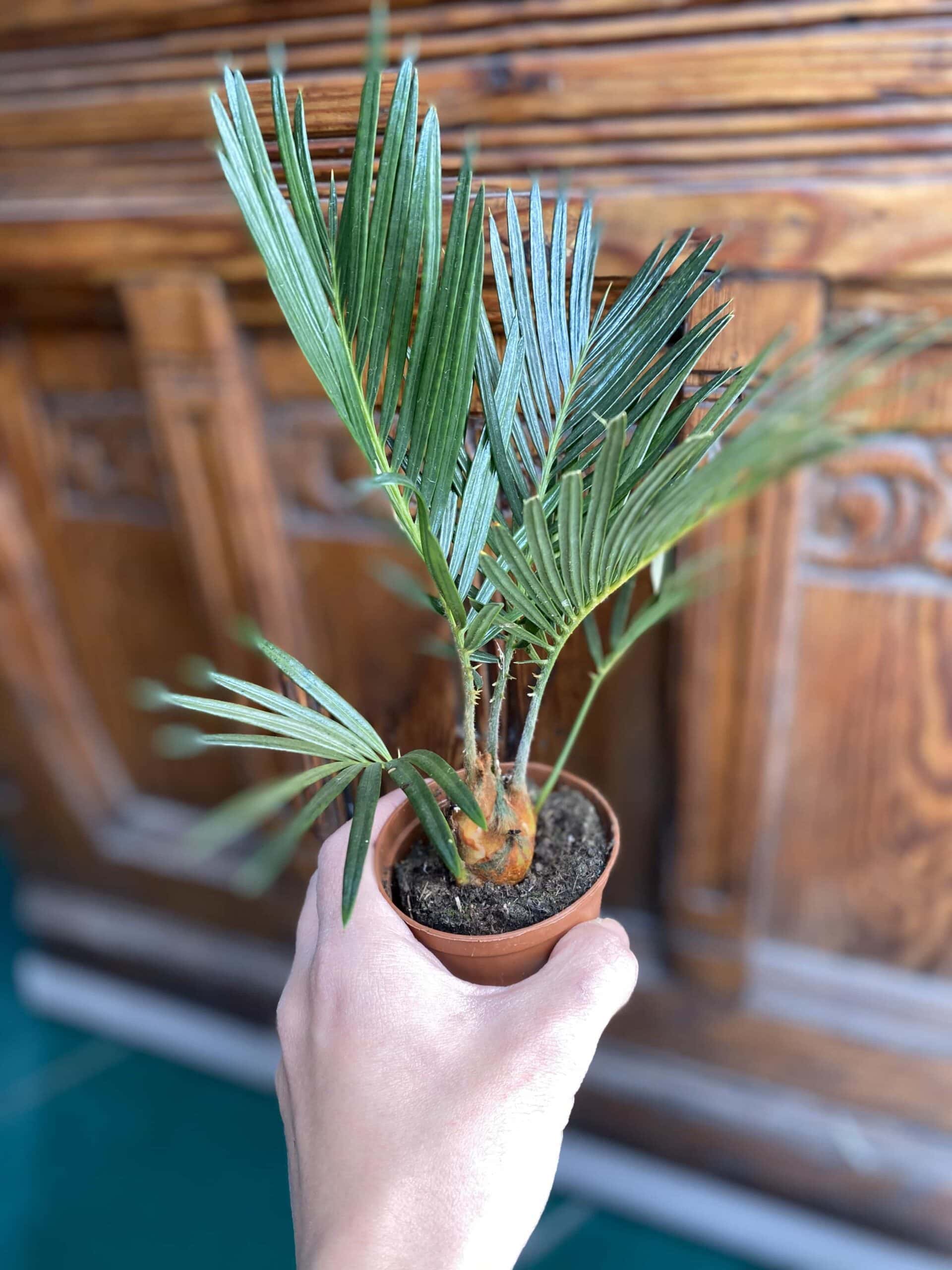 Widoczna na zdjęciu roślina: Cycas Revoluta ma wysokość około 30 cm. Jej doniczka ma 7 cm średnicy oraz 7 cm wysokości.