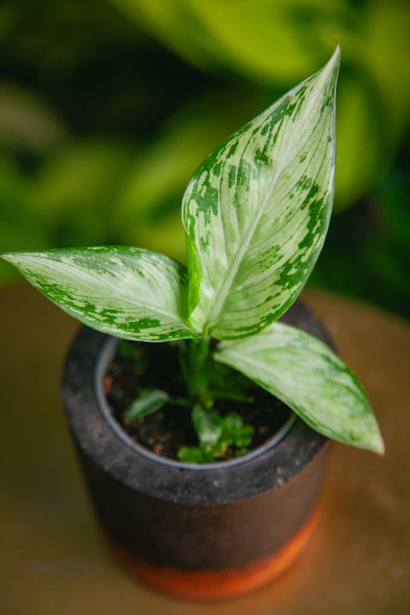 Widoczna na zdjęciu roślina: Dieffenbachia Tropic Snow ma wysokość około 10 cm. Jej doniczka ma 6 cm średnicy oraz 5 cm wysokości.