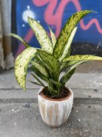 Dieffenbachia Vesuvius to wyjątkowo dekoracyjna odmiana Dieffenbachii. Wzięła swą „płomienną” nazwę od ornamentyki na liściach, która przywodzi na myśl wybuch wulkanu.