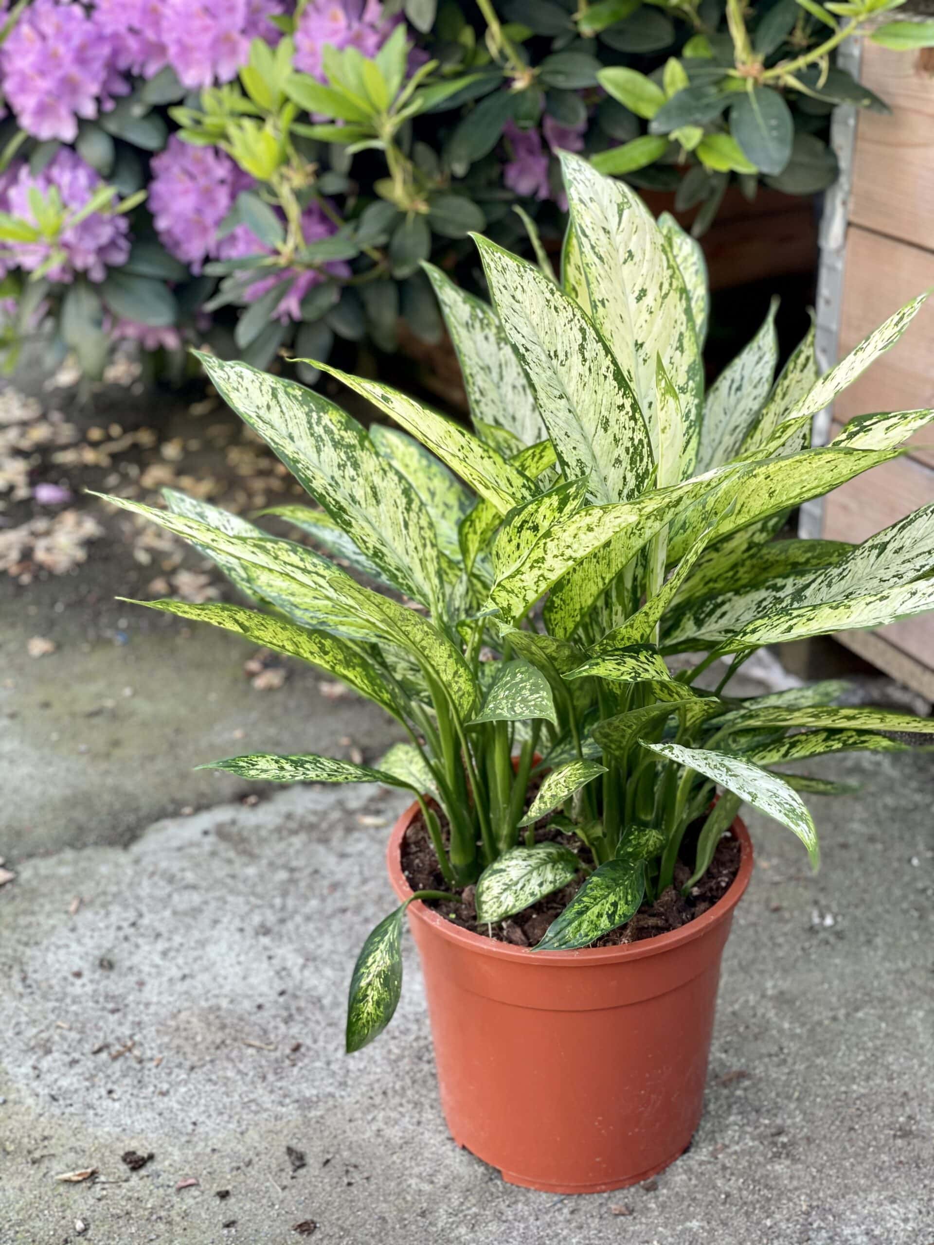 Widoczna na zdjęciu roślina: Diffenbachia Vesuvii ma wysokość około 70 cm. Jej doniczka ma 27 cm średnicy oraz 27 cm wysokości.