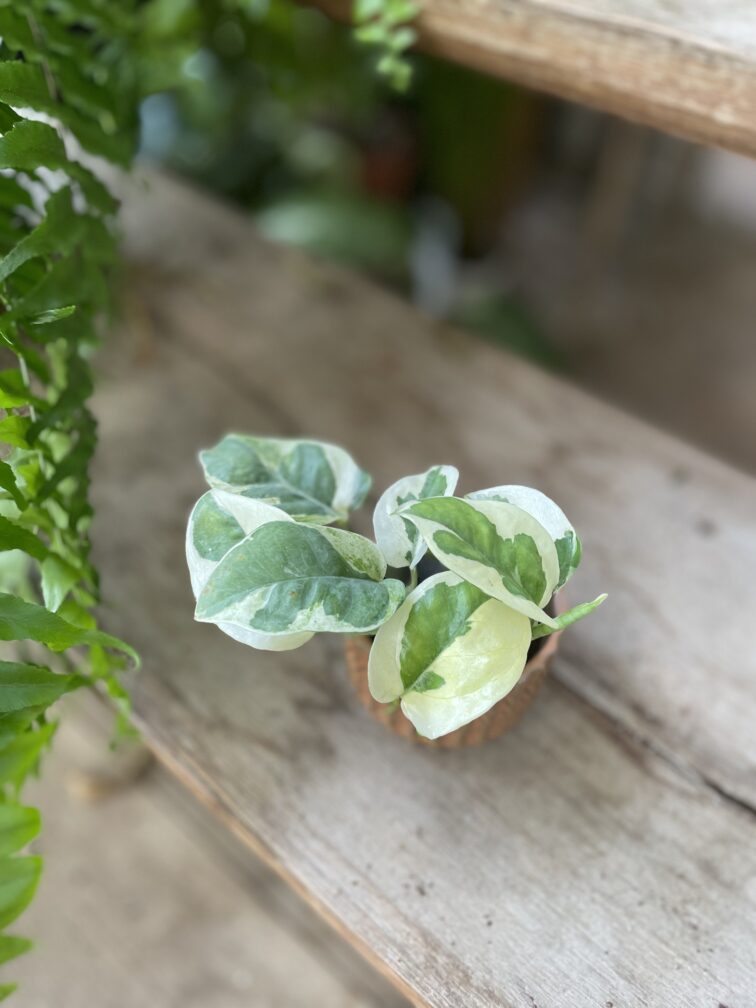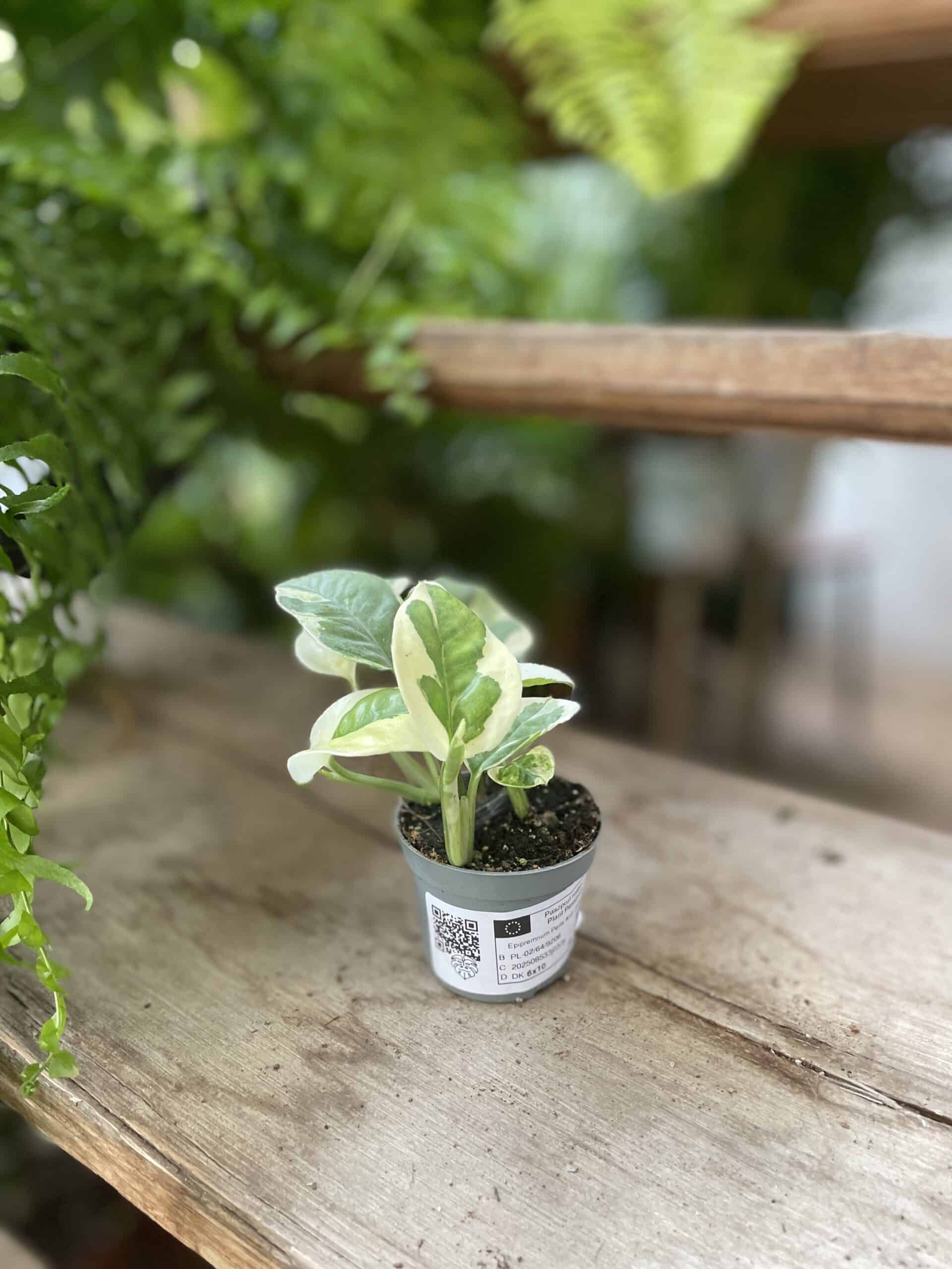 Widoczna na zdjęciu roślina: Epipremnum Njoy ma wysokość około 18 cm. Jej doniczka ma 8 cm średnicy oraz 8 cm wysokości.