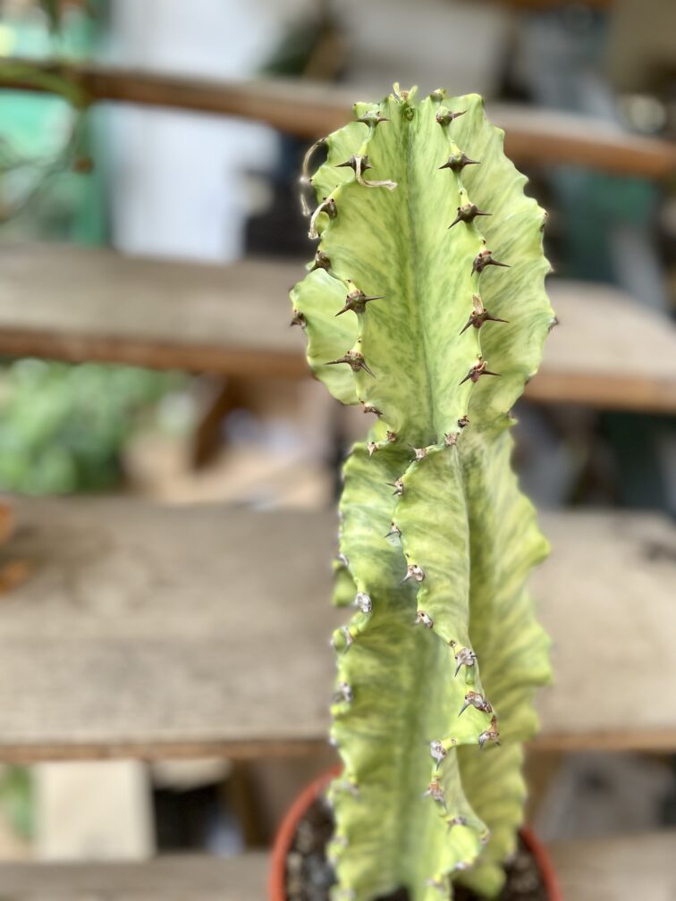 Euphorbia marmorata to sukulent o nietuzinkowym wyglądzie. Wzrok przykuwa jej marmurkowe wybarwienie i karbowana faktura ozdobiona błękitnymi oraz brązowymi kolcami. Potrzebuje dużo słońca i skromnych dawek wody; poza tym nie ma wielkich wymagań i nawet początkujący hodowca powinien dać sobie z nią radę.