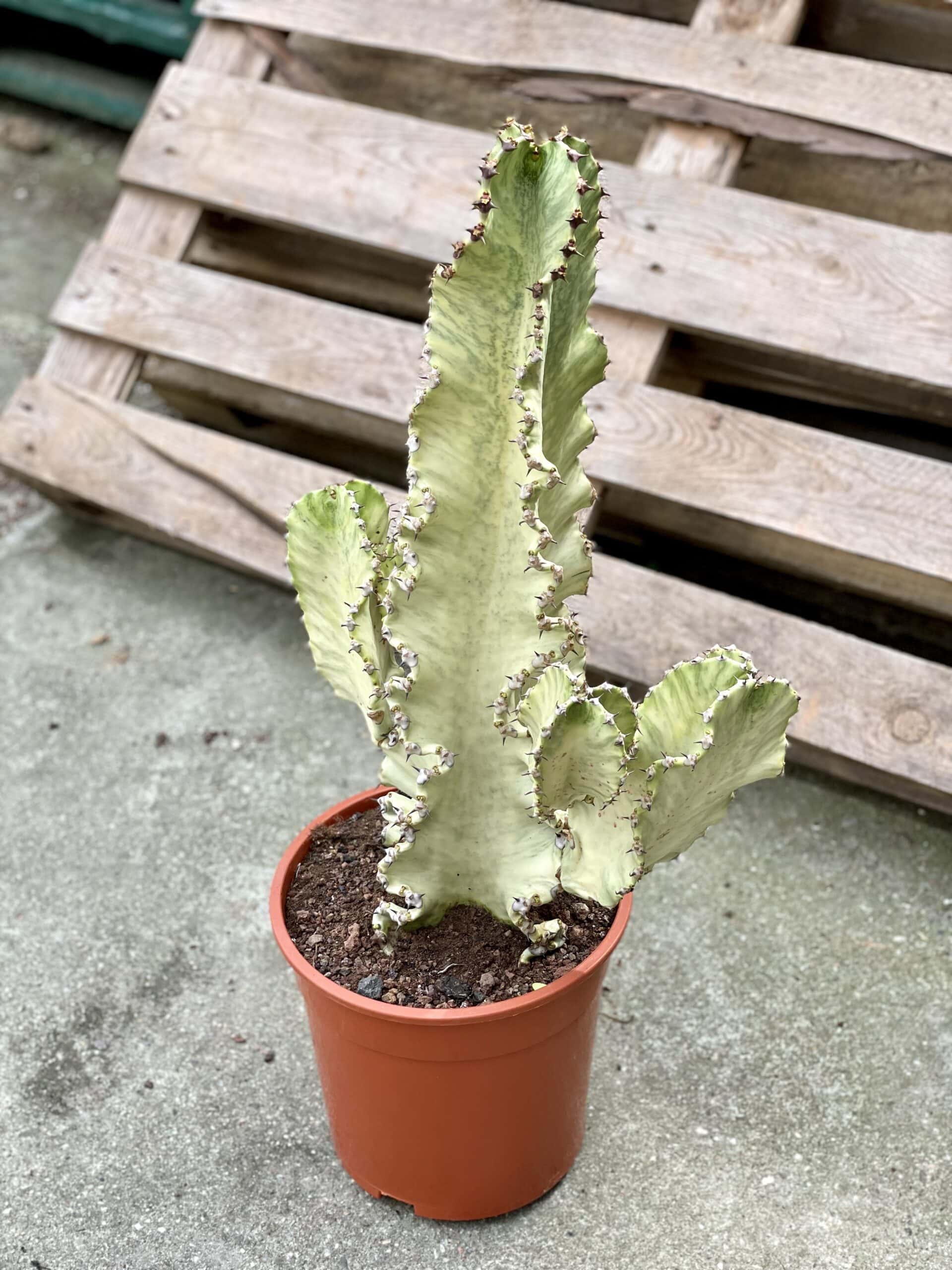 Widoczna na zdjęciu roślina: Euphorbia marmorata ma wysokość około 70 cm. Jej doniczka ma 24 cm średnicy oraz 21 cm wysokości.