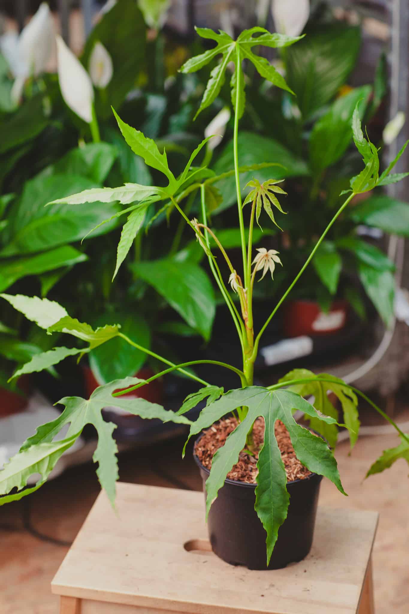 Pielęgnacja: Podlewaj regularnie, utrzymując wilgotność podłoża, ale unikaj przelania. Lubi wysoką wilgotność powietrza. Przycinaj w celu usunięcia uszkodzonych liści i utrzymania kształtu.