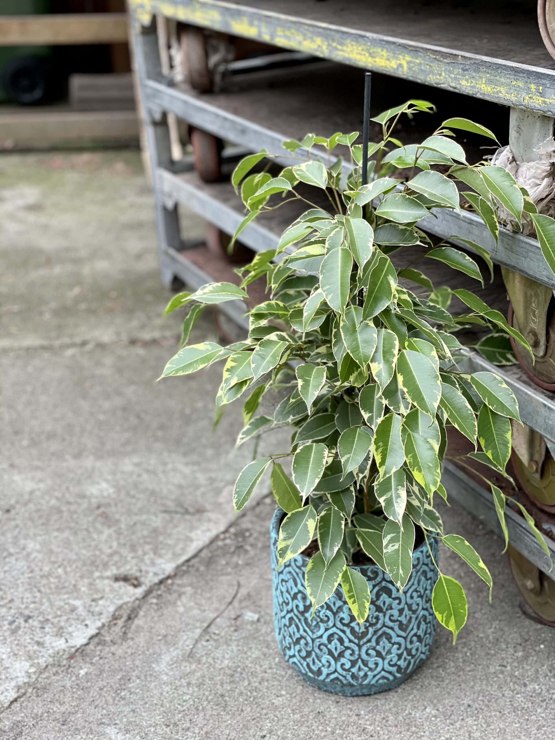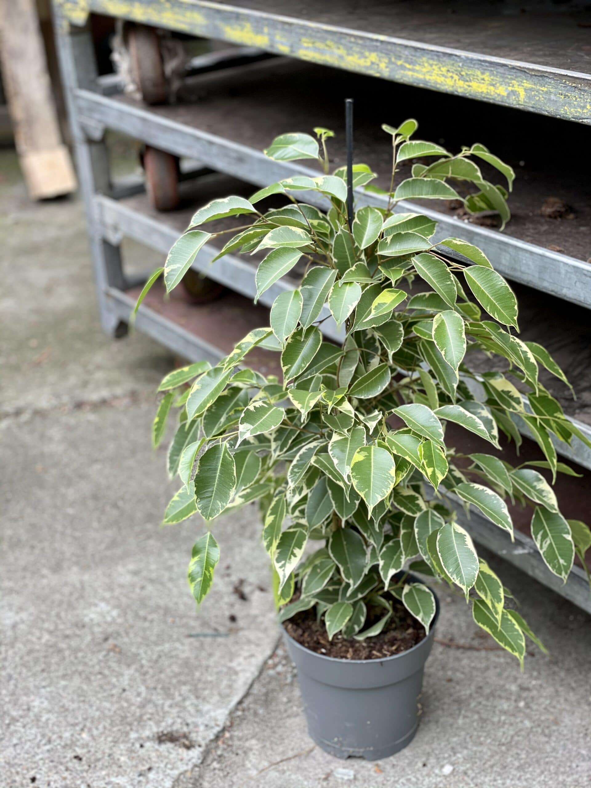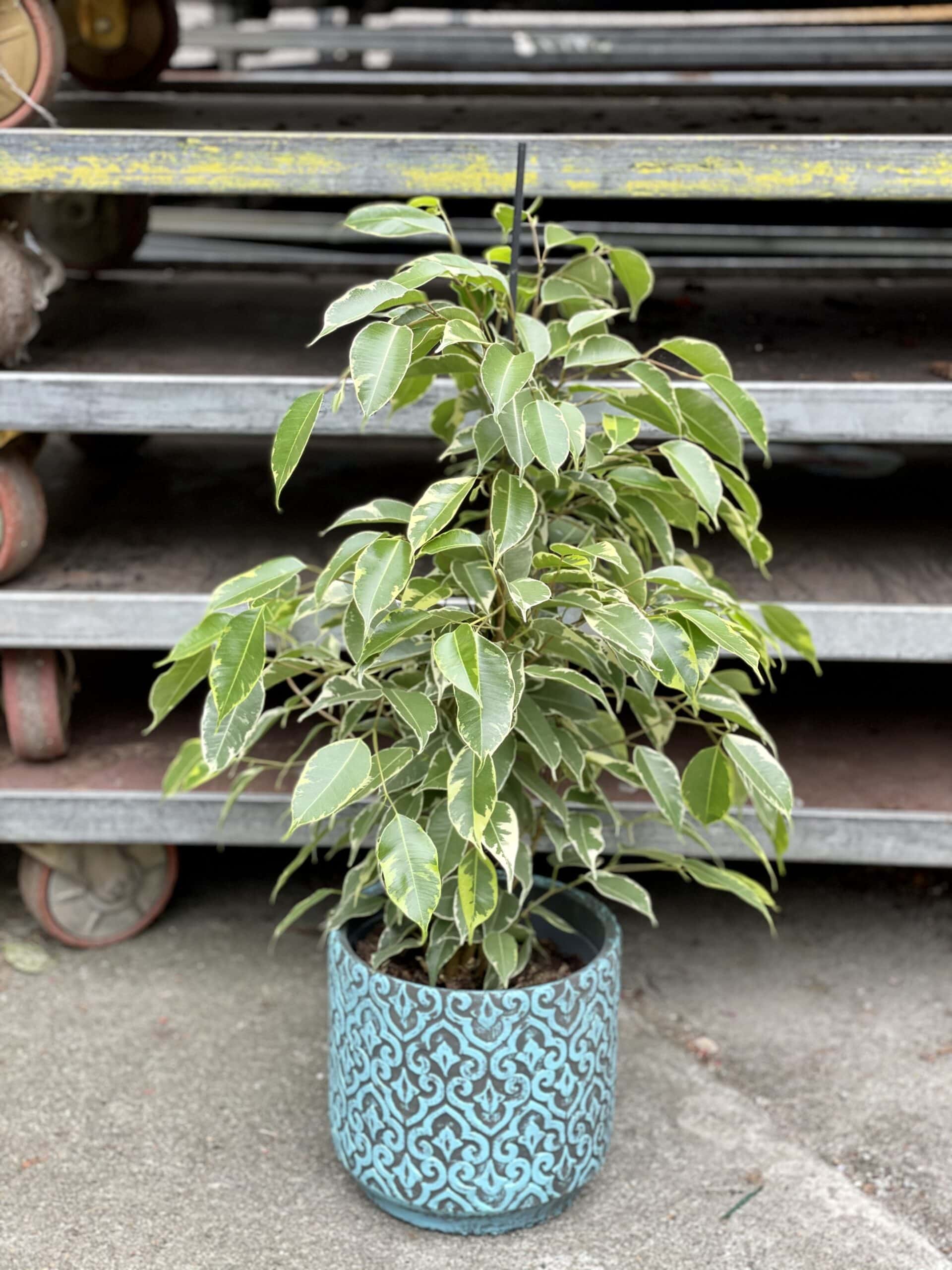 Widoczna na zdjęciu roślina: Ficus benjamina Golden King ma wysokość około 70 cm. Jej doniczka ma 17 cm średnicy oraz 17 cm wysokości.