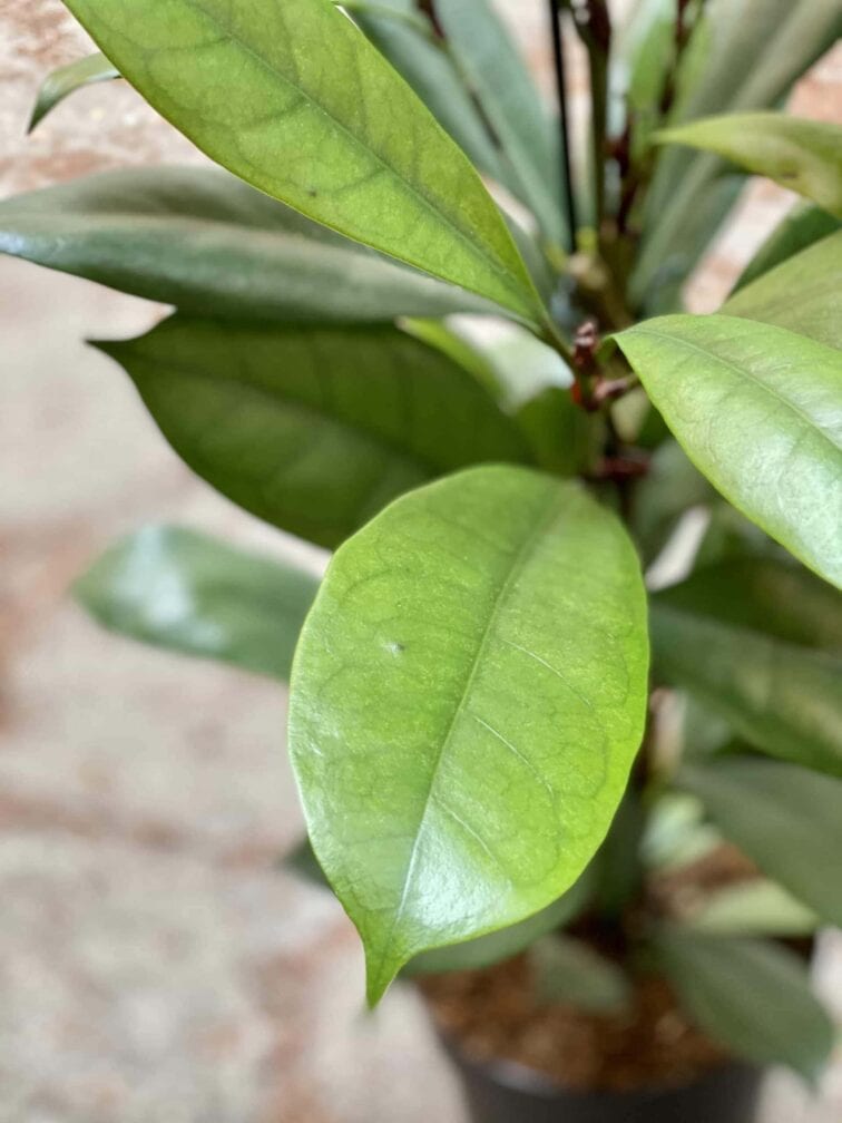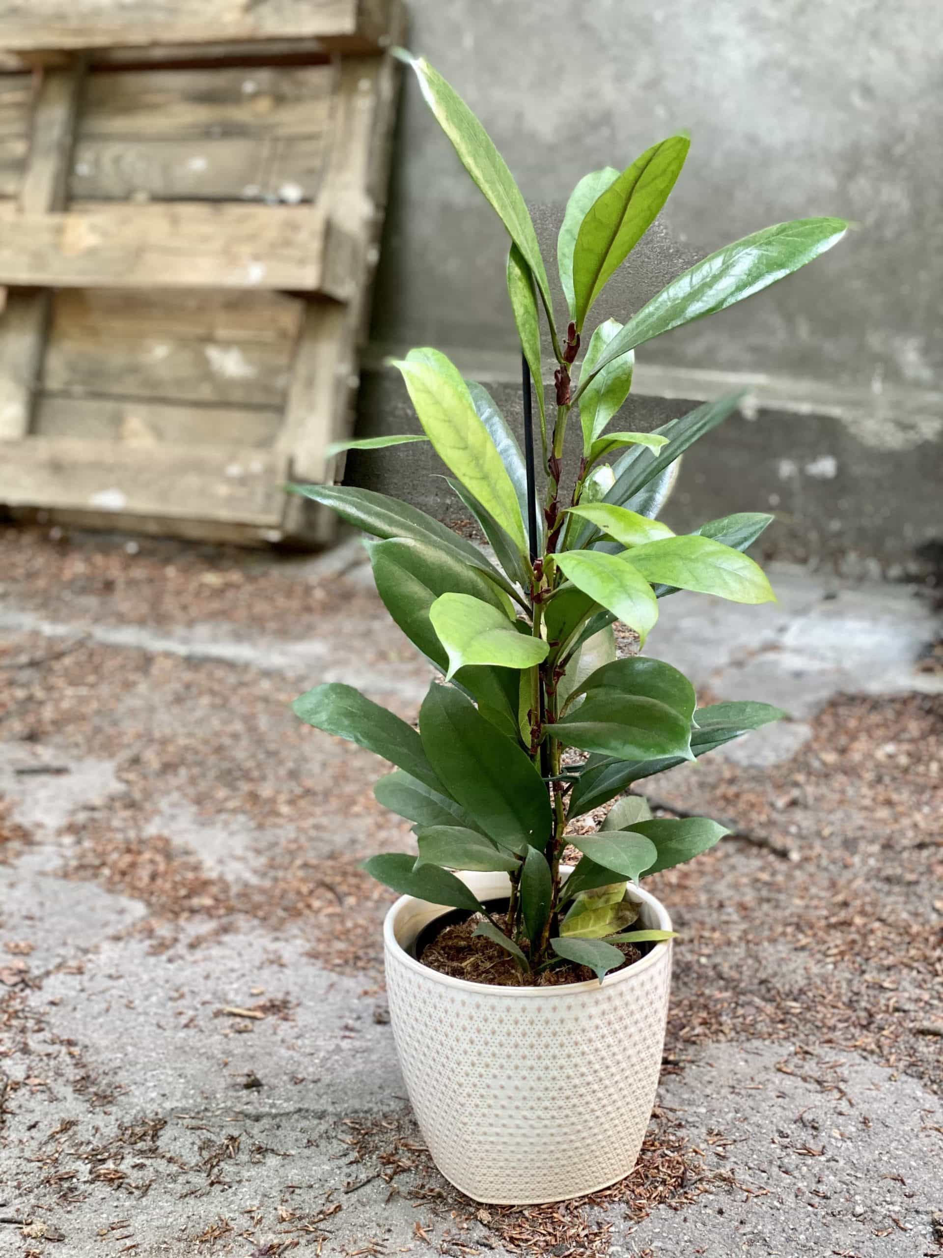 Pielęgnacja: Podlewamy gdy wierzchnia warstwa podłoża przyschnie. Generalnie utrzymujemy lekko wilgotne podłoże i uważamy na przelanie, które może doprowadzić do powstawania brązowych plamek na liściach lub do ich opadania. Od wiosny do jesieni warto zasilić raz lub dwa w miesiącu nawozem dla roślin doniczkowych. Szczęśliwy w luźnym, przepuszczalnym podłożu z dodatkiem perlitu i/lub chipsów kokosowych