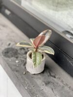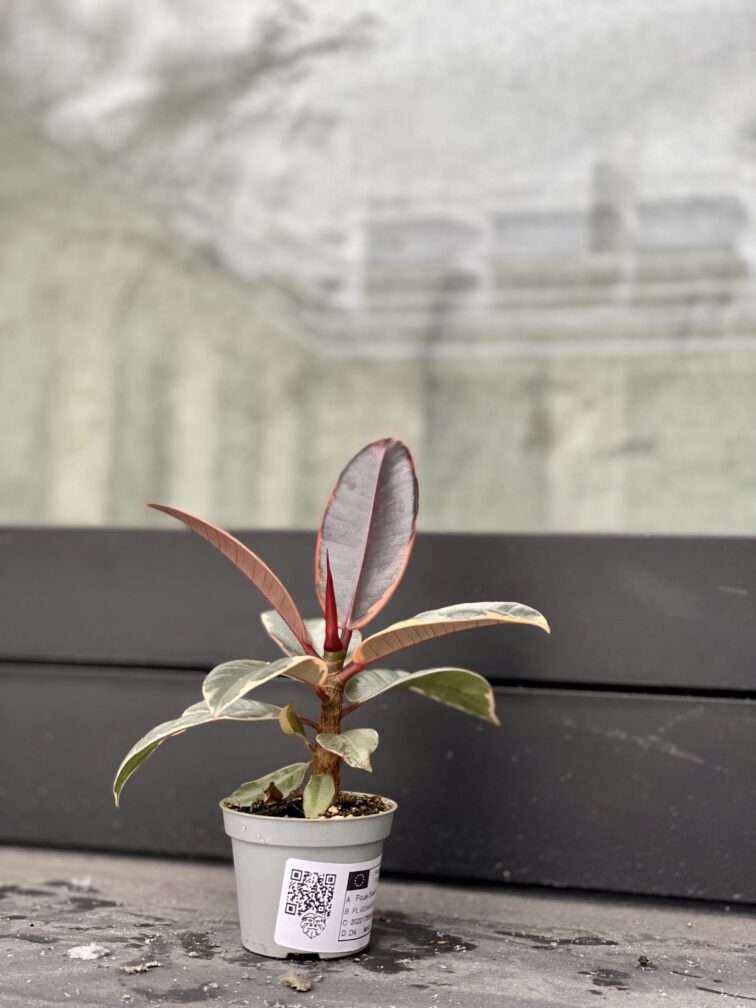 Widoczna na zdjęciu roślina: Ficus elastica Ruby ma wysokość około 20 cm. Jej doniczka ma 6 cm średnicy oraz 5 cm wysokości.