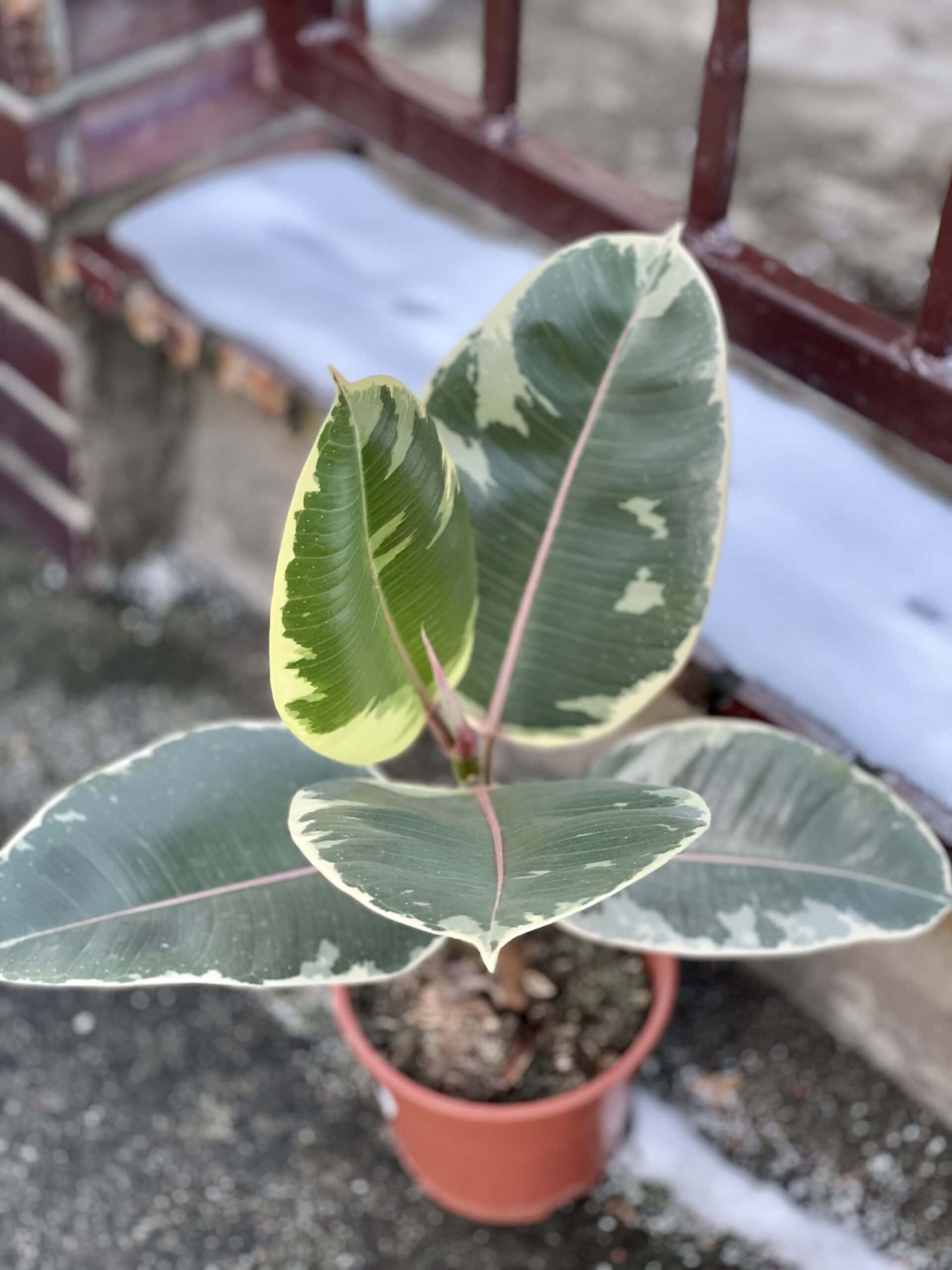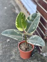 Widoczna na zdjęciu roślina: Ficus Elastica Tineke ma wysokość około 60 cm. Jej doniczka ma 16 cm średnicy oraz 15 cm wysokości.