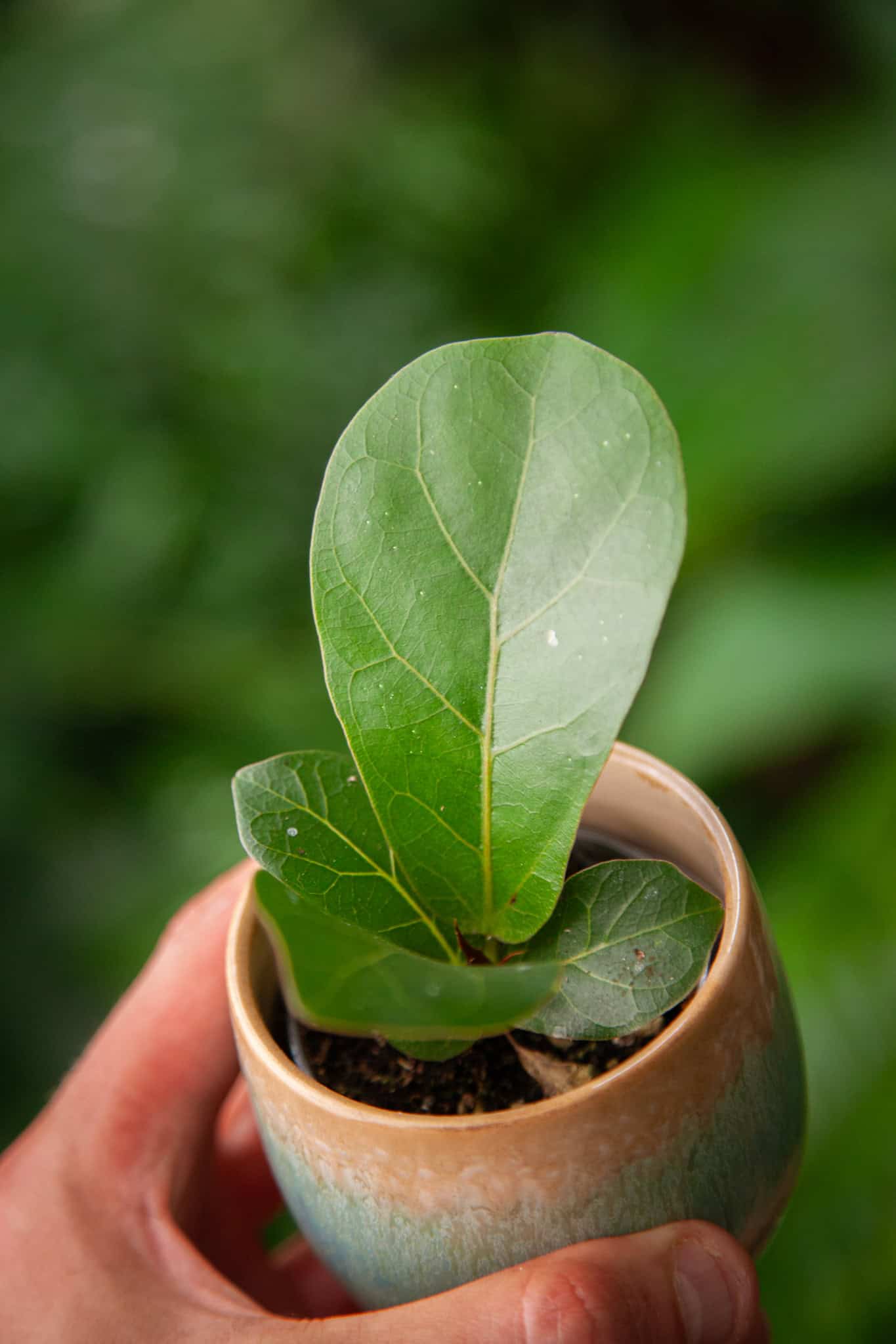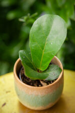 Widoczna na zdjęciu roślina: Ficus Lyrata ma wysokość około 15 cm. Jej doniczka ma 6 cm średnicy oraz 6 cm wysokości.