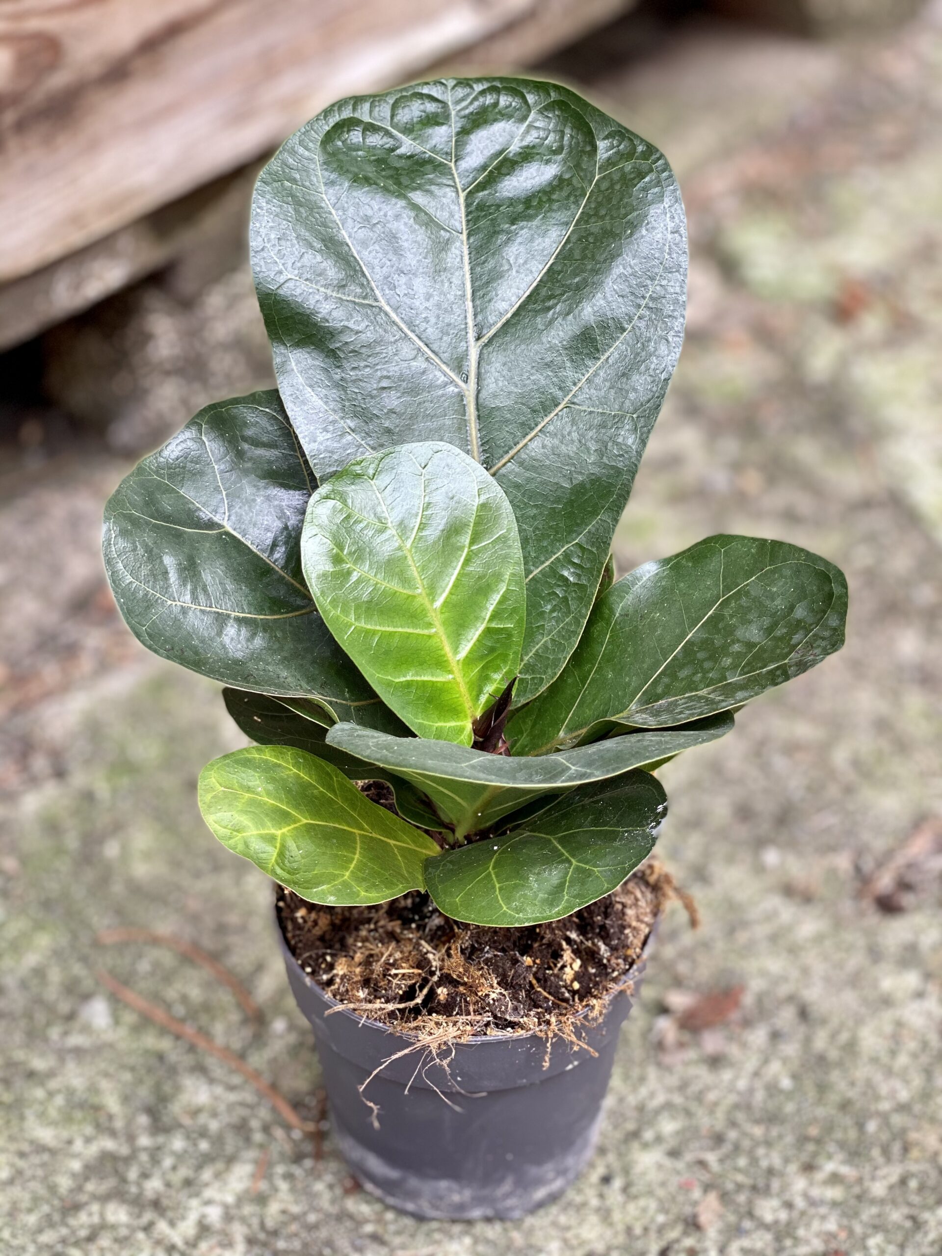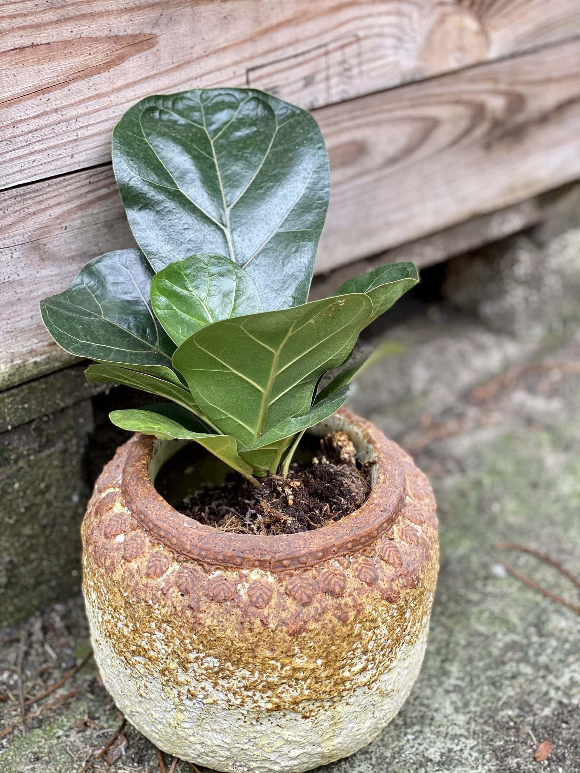 Widoczna na zdjęciu roślina: Ficus lyrata bambino ma wysokość około 30 cm. Jej doniczka ma 11 cm średnicy oraz 10 cm wysokości.