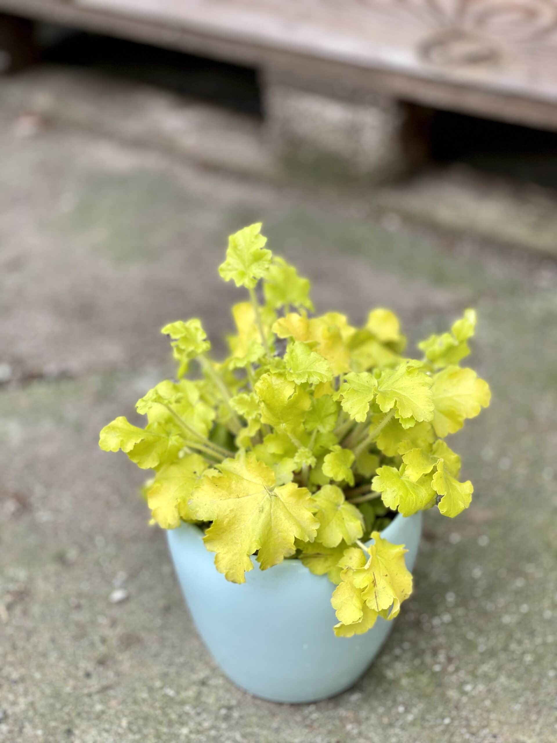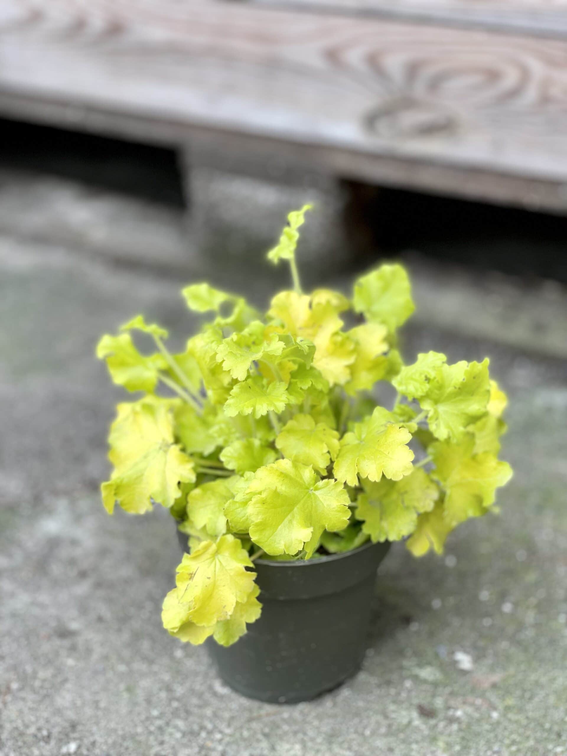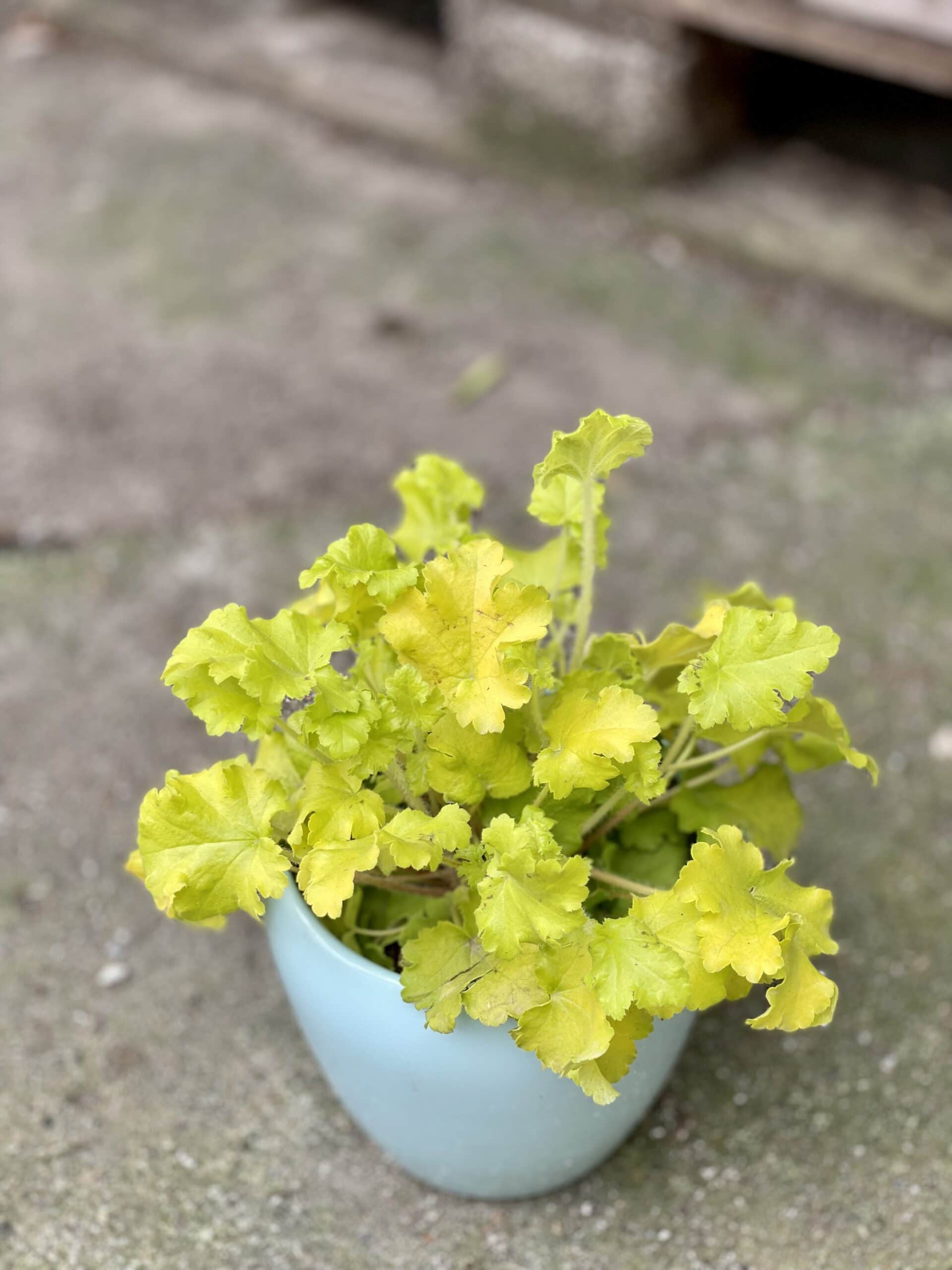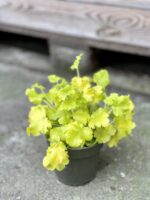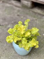 Widoczna na zdjęciu roślina: Heuchera Indian Summer Lime Marmalade (Żurawka) ma wysokość około 25 cm. Jej doniczka ma 12 cm średnicy oraz 12 cm wysokości.